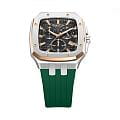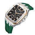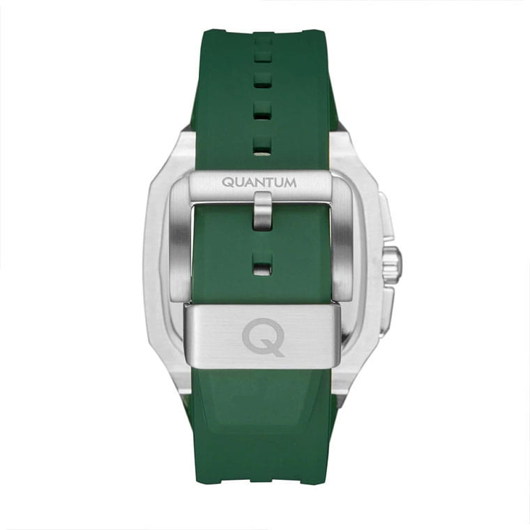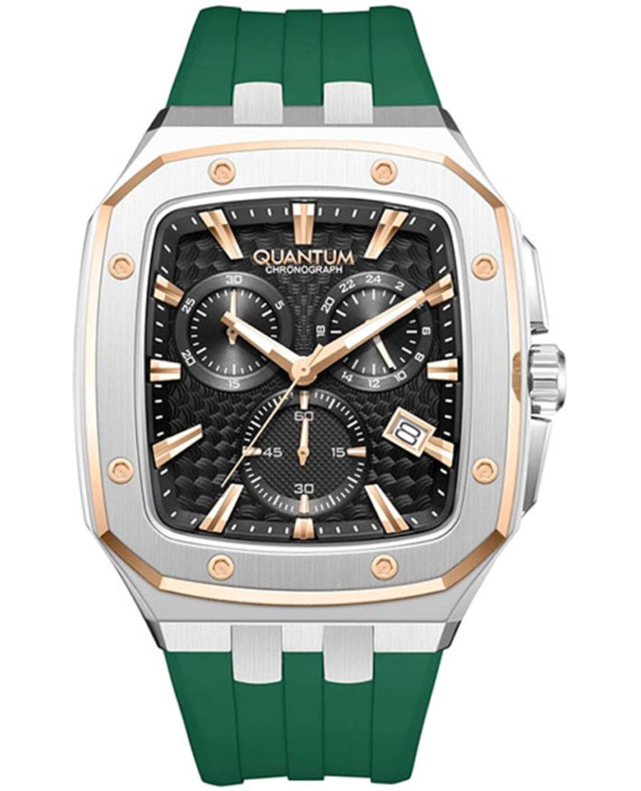 Мужские кварцевые часы Quantum из коллекции Hunter — стильный прямоугольный корпус размером 44 мм из нержавеющей стали. БезельБезельВнешний ободок, закрепляющий стекло. В спортивных часах так называется поворотное кольцо с делениями на циферблате, выполняет роль таймера – замеряет отрезки времени на шкале. Неподвижный безель – элемент декора. Однонаправленно вращающийся безель на дайверских часах позволяет фиксировать моменты погружения и выныривания на поверхность. с частичным PVD-покрытиемPVDУльтратонкое покрытие наносится в технике вакуумного напыления, сочетает в себе нитрид титана особой прочности со слоем золота или оксида хрома. Несёт в себе декоративную или защитную функцию., чёрный циферблат с функциями хронографаХронографФункция позволяет измерять отрезки времени с особой точностью: часы, минуты, секунды. Верным признаком хронографа является наличие на циферблате 3 дополнительных окошек-счётчиков., секундомера и окошком даты. Стекло — минеральноеМинеральное стеклоМинеральное стекло представляет собой искусственно выращенный минерал кварца. Такое стекло отличается особой устойчивостью к повреждениям и царапинам. Уступает по некоторым качествам сапфировому стеклу. с антибликовым покрытием. Механизм — японский кварцевый Seiko. Водонепроницаемость 100 м. Ремешок — зелёный силиконовый на стандартной застёжке. Идеальный выбор для тех, кто ценит турецкий дизайн и спортивный характер.