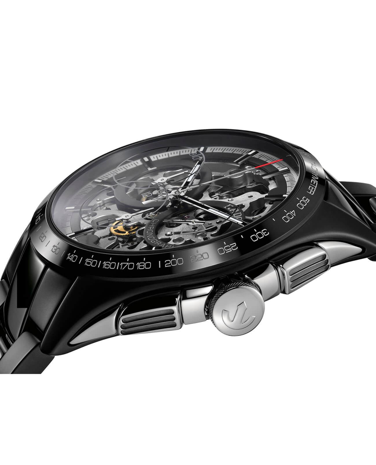Наручные часы-скелетоны позволяют стать центром внимания в любой компании, демонстрируя безупречную точность хода сквозь прозрачный циферблат. Может показаться, что движение деталей калибра ETA 2894-2 отвлекает от просмотра времени, но нет - метки и стрелки отлично видно, для удобства секундная стрелка имеет красный наконечник. Моноблочный корпус выполнен из нержавеющей стали 316L и высокотехнологичной керамикиВысокотехнологичная керамикаИнновационный запатентованный Rado материал с гладкой или матовой поверхностью. Керамика за счёт кристаллической структуры обладает повышенной устойчивостью от возникновения царапин. Материал способен принимать температуру тела человека, обеспечивая невероятный комфорт при ношении.. Запас хода до 45 часов. Прозрачная задняя крышка. Сапфировое стекло с антибликовой поверхностью. ХронографХронографФункция позволяет измерять отрезки времени с особой точностью: часы, минуты, секунды. Верным признаком хронографа является наличие на циферблате 3 дополнительных окошек-счётчиков., секундомер, тахиметрТахиметрРазмеченная шкала, располагается на ободке или безеле часов. Тахиметр позволяет рассчитать скорость на определённом участке пути, расстояние измеряется в километрах или милях.. Водостойкость до 5 бар. Диаметр корпуса: 45 мм.