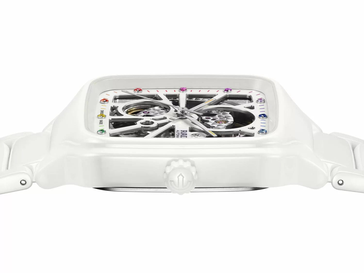 True Square - это новый взгляд на культовую форму Rado. Первые часы True Square, изготовленные с использованием моноблочного высокотехнологичного керамическогоВысокотехнологичная керамикаИнновационный запатентованный Rado материал с гладкой или матовой поверхностью. Керамика за счёт кристаллической структуры обладает повышенной устойчивостью от возникновения царапин. Материал способен принимать температуру тела человека, обеспечивая невероятный комфорт при ношении. корпуса квадратной формы, легкие, устойчивые к царапинам и удобные в носке. Швейцарский автоматический механизм отличается резервом хода на 80 часов. Стрелки и метки дополнены ярким люминесцентным покрытиемЛюминесцентное покрытиеПозволяет считывать показания времени в темноте. Производители наносят на стрелки, часовые индексы, безель или поверхность циферблата светонакопительный состав, дающий холодное свечение.. Сапфировое стеклоСапфировое стеклоПрочный и надёжный материал из кристалла сапфира синтетического происхождения, характеризующийся особой твёрдостью и устойчивостью к царапинам и повреждениям. на 100% устойчиво к царапинам. Отличительный дизайн автоматического открытого сердца Rado True Square Automatic Open Heart - это воплощение будущих достижений. Керамический браслет на застёжке-бабочке с кнопкамиЗастёжка "бабочка"Такой вид застёжки дополняется предохранителями, помогающими избежать случайного раскрытия браслета. Обладают изящным исполнением. . Двенадцать цветных драгоценных камней добавляют нотку цвета и роскоши циферблату.