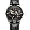 Несмотря на общее классическое исполнение, наручные часы выглядят ярко и эффектно, лучше всего гармонируя с брендовыми деловыми костюмами. Скелетонизированный циферблат выполнен с метками в виде штрихов, украшенных черным шпоном. Оригинальное окошко даты в положении 6 часа. Корпус выполнен из керамики и металла. Ремешок из натуральной кожи. Сапфировое стеклоСапфировое стеклоПрочный и надёжный материал из кристалла сапфира синтетического происхождения, характеризующийся особой твёрдостью и устойчивостью к царапинам и повреждениям. с покрытием «антиблик». Кожаный ремешок с раскладной застёжкойРаскладная застёжкаТакой тип застёжки используется только на браслетах из металла. Она никогда не раскрывается полностью, происходит разделение на 2 и более частей. Раскладывающая застёжка снизит вероятность потери часов к минимуму.. Прозрачная задняя крышка открывает обзор на слаженную работу механизма. Диаметр корпуса: 40,7 мм.