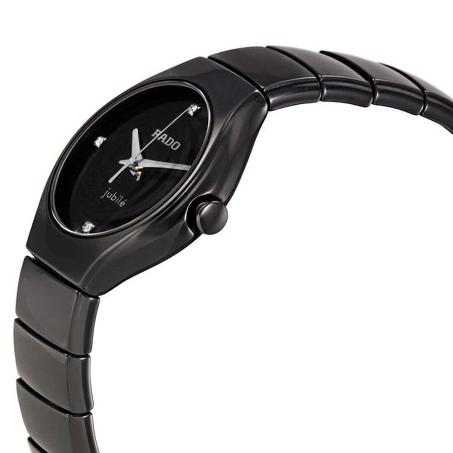 Глянцевый корпус представлен в оригинальном дизайне, его линии плавно перетекают в браслет. Наручные часы выполнены из высокотехнологичной керамикиВысокотехнологичная керамикаИнновационный запатентованный Rado материал с гладкой или матовой поверхностью. Керамика за счёт кристаллической структуры обладает повышенной устойчивостью от возникновения царапин. Материал способен принимать температуру тела человека, обеспечивая невероятный комфорт при ношении., материал не вызывает аллергии и обеспечивает невероятный комфорт при ношении. Сапфировое стеклоСапфировое стеклоПрочный и надёжный материал из кристалла сапфира синтетического происхождения, характеризующийся особой твёрдостью и устойчивостью к царапинам и повреждениям. устойчиво к образованию царапин. Водостойкость 3 бар. Застёжка «бабочка» с кнопкамиЗастёжка "бабочка"Такой вид застёжки дополняется предохранителями, помогающими избежать случайного раскрытия браслета. Обладают изящным исполнением. . Циферблат с серебристыми стрелками и бриллиантами отмечает позиции четверти часа.