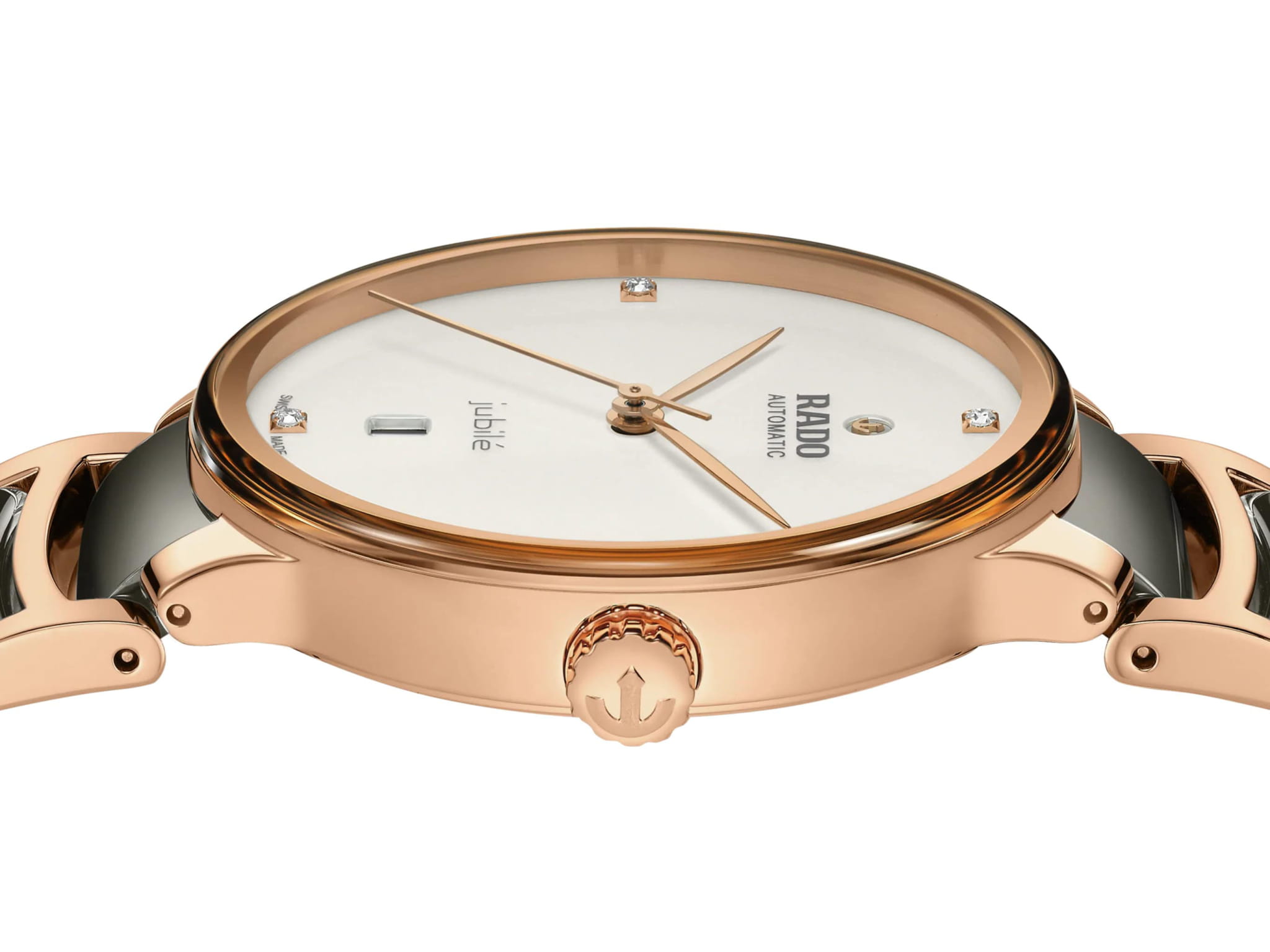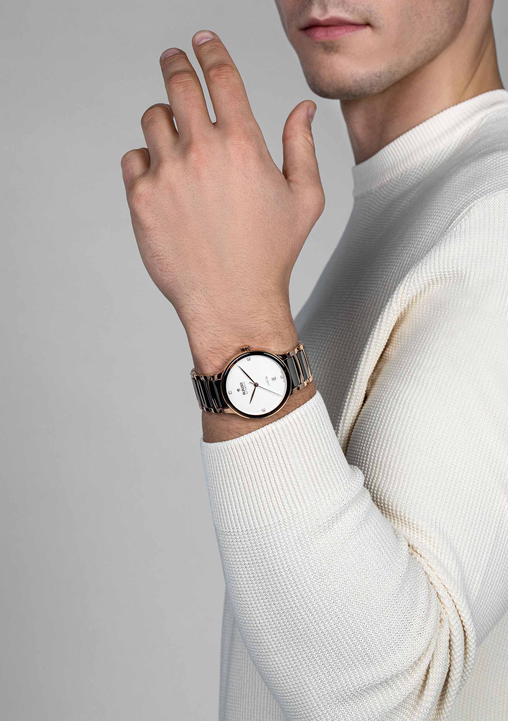 Аксессуар с белым циферблатом являет собой сочетание классической красоты и современного дизайна, отражающего минимализм. Его безупречная работа обеспечивается за счёт швейцарского автоматического механизма с 80-часовым запасом хода. Прозрачная задняя крышка позволяет прикоснуться к часовому искусству и понаблюдать за движением деталей. Сапфировое стеклоСапфировое стеклоПрочный и надёжный материал из кристалла сапфира синтетического происхождения, характеризующийся особой твёрдостью и устойчивостью к царапинам и повреждениям.. Браслет из высокотехнологичной керамики и нержавеющей стали с PVDPVDУльтратонкое покрытие наносится в технике вакуумного напыления, сочетает в себе нитрид титана особой прочности со слоем золота или оксида хрома. Несёт в себе декоративную или защитную функцию. покрытием. Водонепроницаемость 50 метров. . Окошко даты.
