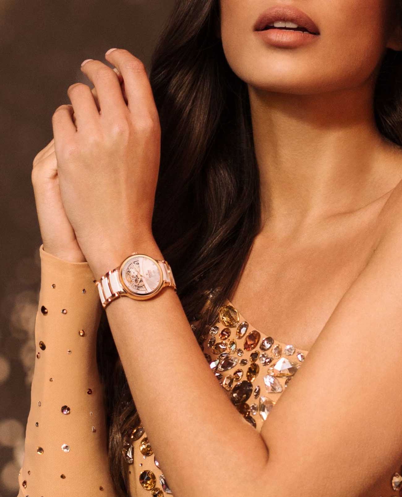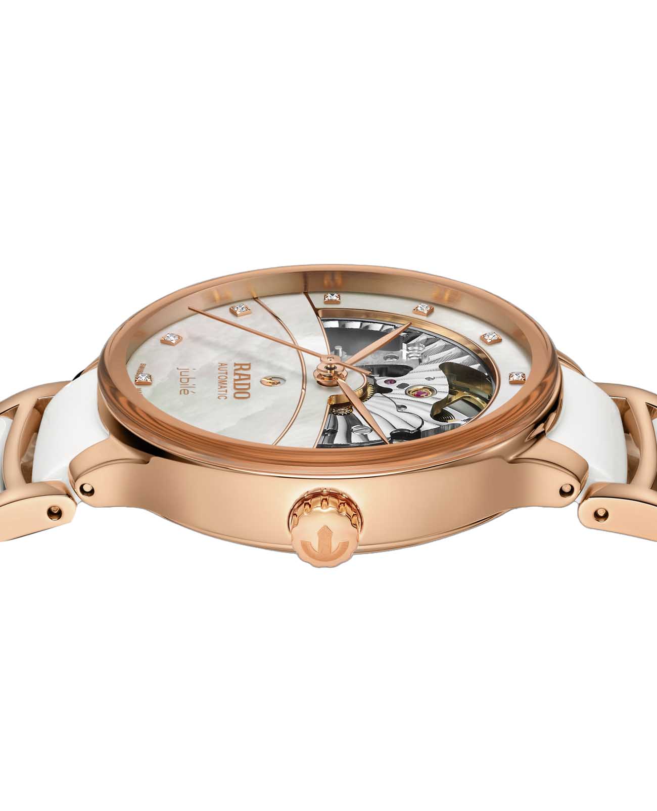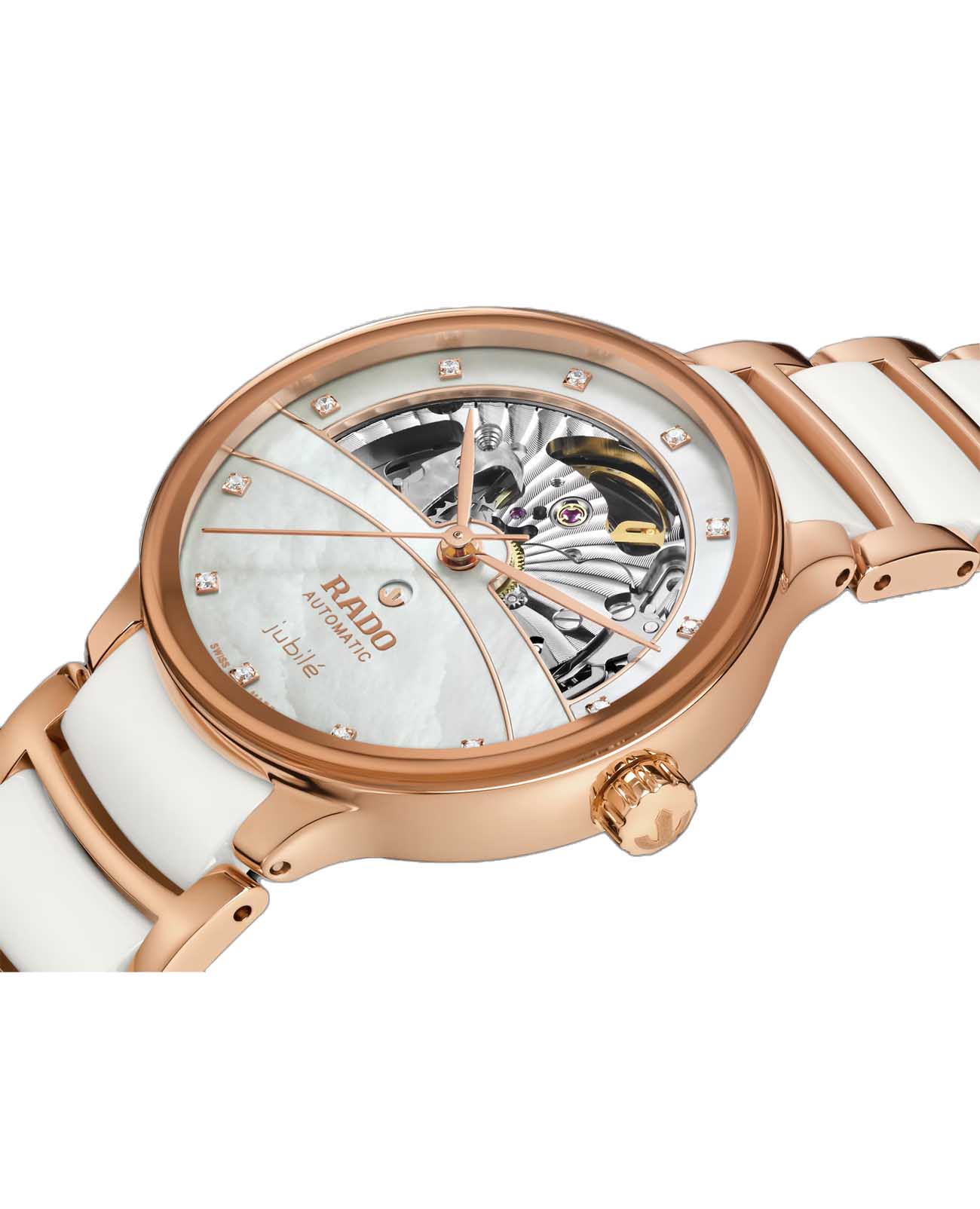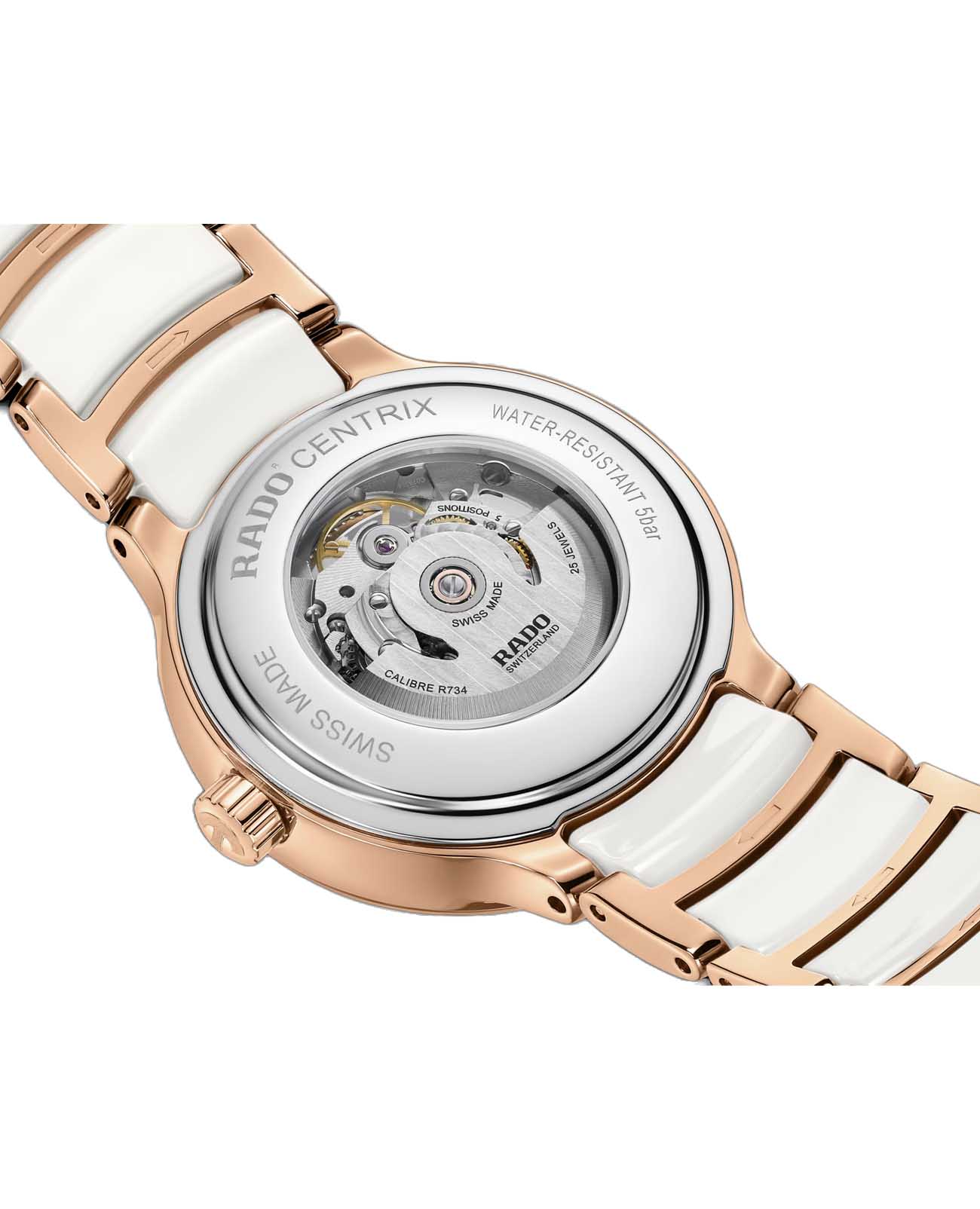 Женские механические швейцарские часы-скелетоны Rado Centrix Automatic Diamonds Open Heart R30029922 из коллекции Rado Centrix отражают собой часовое искусство в премиальном исполнении. Сапфировое стеклоСапфировое стеклоПрочный и надёжный материал из кристалла сапфира синтетического происхождения, характеризующийся особой твёрдостью и устойчивостью к царапинам и повреждениям. устойчивое к мелким механическим повреждениям. Корпус часов изготовлен из нержавеющей стали с PVD-покрытиемPVDУльтратонкое покрытие наносится в технике вакуумного напыления, сочетает в себе нитрид титана особой прочности со слоем золота или оксида хрома. Несёт в себе декоративную или защитную функцию.. Скелетонизированный циферблат инкрустирован бриллиантами. Класс водозащиты: 50 метров, позволит защитить корпус от случайных брызг или капель дождя. Браслет из стали и высокотехнологичной керамикиВысокотехнологичная керамикаИнновационный запатентованный Rado материал с гладкой или матовой поверхностью. Керамика за счёт кристаллической структуры обладает повышенной устойчивостью от возникновения царапин. Материал способен принимать температуру тела человека, обеспечивая невероятный комфорт при ношении. на раскладной застёжкеРаскладная застёжкаТакой тип застёжки используется только на браслетах из металла. Она никогда не раскрывается полностью, происходит разделение на 2 и более частей. Раскладывающая застёжка снизит вероятность потери часов к минимуму..
