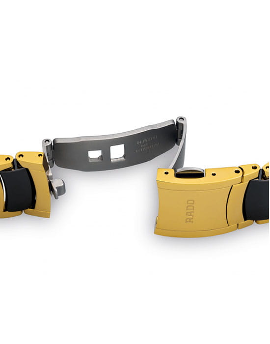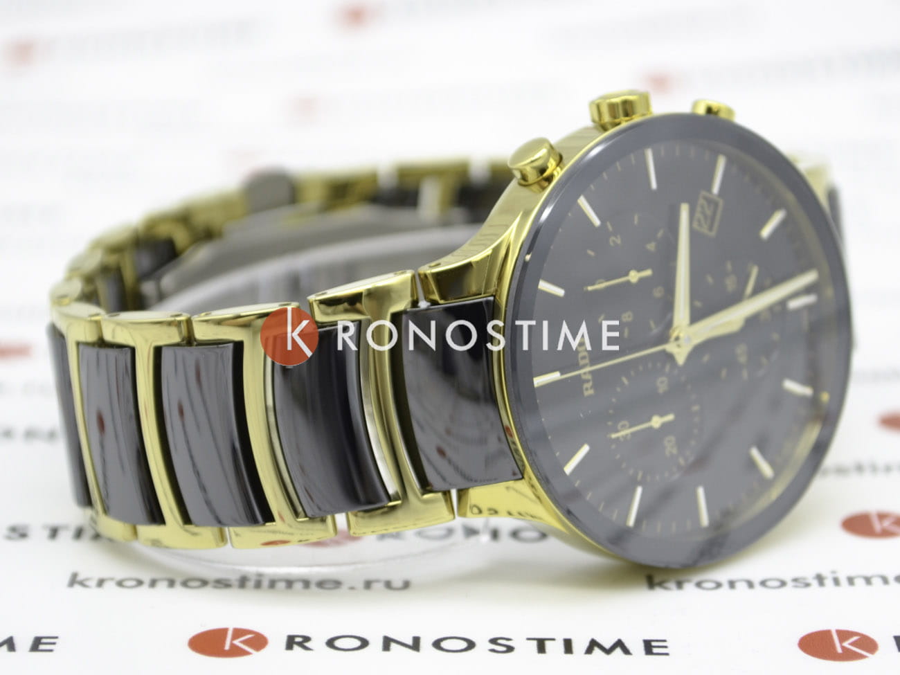 Премиальный хронографХронографФункция позволяет измерять отрезки времени с особой точностью: часы, минуты, секунды. Верным признаком хронографа является наличие на циферблате 3 дополнительных окошек-счётчиков. отличается лаконичным оформлением и использованием сдержанных оттенков. Такое исполнение позволяет носить часы с деловым, повседневным образом, костюмом на торжественный случай. Внутри надёжного корпуса из высокотехнологичной керамикиВысокотехнологичная керамикаИнновационный запатентованный Rado материал с гладкой или матовой поверхностью. Керамика за счёт кристаллической структуры обладает повышенной устойчивостью от возникновения царапин. Материал способен принимать температуру тела человека, обеспечивая невероятный комфорт при ношении. находится кварцевый механизм ETA 251.274 с 22 камнями. Браслет из нержавеющей стали 316L с керамическими вставками и золотистым PVD-покрытиемPVDУльтратонкое покрытие наносится в технике вакуумного напыления, сочетает в себе нитрид титана особой прочности со слоем золота или оксида хрома. Несёт в себе декоративную или защитную функцию.. Сапфировое стекло. Люминесцентная подсветкаЛюминесцентное покрытиеПозволяет считывать показания времени в темноте. Производители наносят на стрелки, часовые индексы, безель или поверхность циферблата светонакопительный состав, дающий холодное свечение.. Апертура даты. Диаметр корпуса: 40 мм.