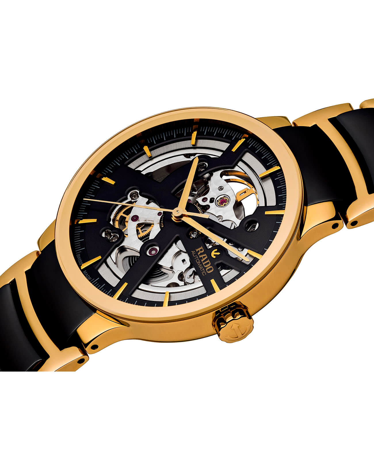Часы-скелетоны станут главным атрибутом в создании индивидуального образа, оригинальная модель точно станет объектом притяжения окружающих. Внутри корпуса из нержавеющей стали заключён автоматический калибр ETA C07.631 с запасом хода 80 часов. Стальной браслет дополнен вставками из высокотехнологичной керамикиВысокотехнологичная керамикаИнновационный запатентованный Rado материал с гладкой или матовой поверхностью. Керамика за счёт кристаллической структуры обладает повышенной устойчивостью от возникновения царапин. Материал способен принимать температуру тела человека, обеспечивая невероятный комфорт при ношении.. Стекло из сапфира устойчиво к образованию царапин. Водостойкость 3 бар. Золотистое PVD-покрытиеPVDУльтратонкое покрытие наносится в технике вакуумного напыления, сочетает в себе нитрид титана особой прочности со слоем золота или оксида хрома. Несёт в себе декоративную или защитную функцию.. Диаметр корпуса: 38 мм.