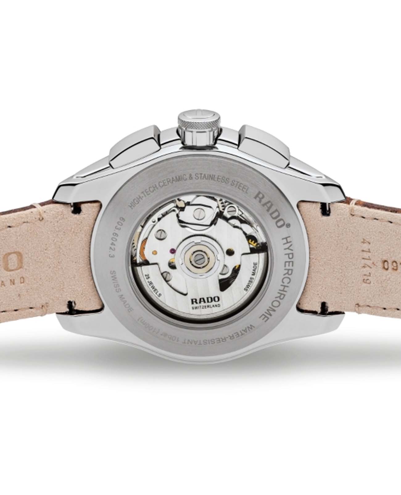 Мужские механические швейцарские часы-хронографХронографФункция позволяет измерять отрезки времени с особой точностью: часы, минуты, секунды. Верным признаком хронографа является наличие на циферблате 3 дополнительных окошек-счётчиков. с автоподзаводом Rado Hyperchrome Automatic Chronograph R32042205. Сапфировое стеклоСапфировое стеклоПрочный и надёжный материал из кристалла сапфира синтетического происхождения, характеризующийся особой твёрдостью и устойчивостью к царапинам и повреждениям. устойчивое к мелким механическим повреждениям. Корпус часов изготовлен из нержавеющей стали и титана. БезельБезельВнешний ободок, закрепляющий стекло. В спортивных часах так называется поворотное кольцо с делениями на циферблате, выполняет роль таймера – замеряет отрезки времени на шкале. Неподвижный безель – элемент декора. Однонаправленно вращающийся безель на дайверских часах позволяет фиксировать моменты погружения и выныривания на поверхность. со шкалой тахиметраТахиметрРазмеченная шкала, располагается на ободке или безеле часов. Тахиметр позволяет рассчитать скорость на определённом участке пути, расстояние измеряется в километрах или милях. из высокотехнологичной керамикиВысокотехнологичная керамикаИнновационный запатентованный Rado материал с гладкой или матовой поверхностью. Керамика за счёт кристаллической структуры обладает повышенной устойчивостью от возникновения царапин. Материал способен принимать температуру тела человека, обеспечивая невероятный комфорт при ношении.. Окошко даты находится в положении между 4 и 5 часами. Стрелки с люминесцентным покрытиемЛюминесцентное покрытиеПозволяет считывать показания времени в темноте. Производители наносят на стрелки, часовые индексы, безель или поверхность циферблата светонакопительный состав, дающий холодное свечение.. Класс водозащиты: 100 метров, позволит плавать, нырять и заниматься другими водными видами спорта. Кожаный ремешок на раскладной застёжкеРаскладная застёжкаТакой тип застёжки используется только на браслетах из металла. Она никогда не раскрывается полностью, происходит разделение на 2 и более частей. Раскладывающая застёжка снизит вероятность потери часов к минимуму..