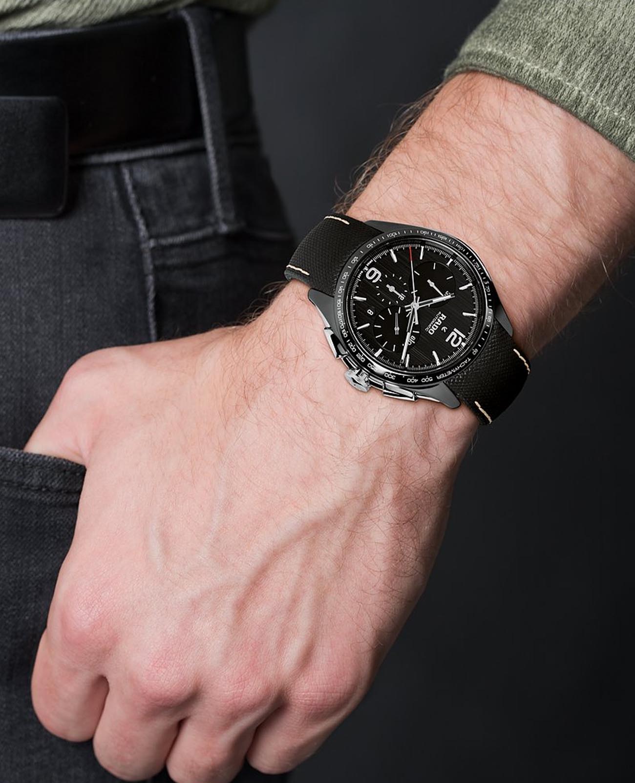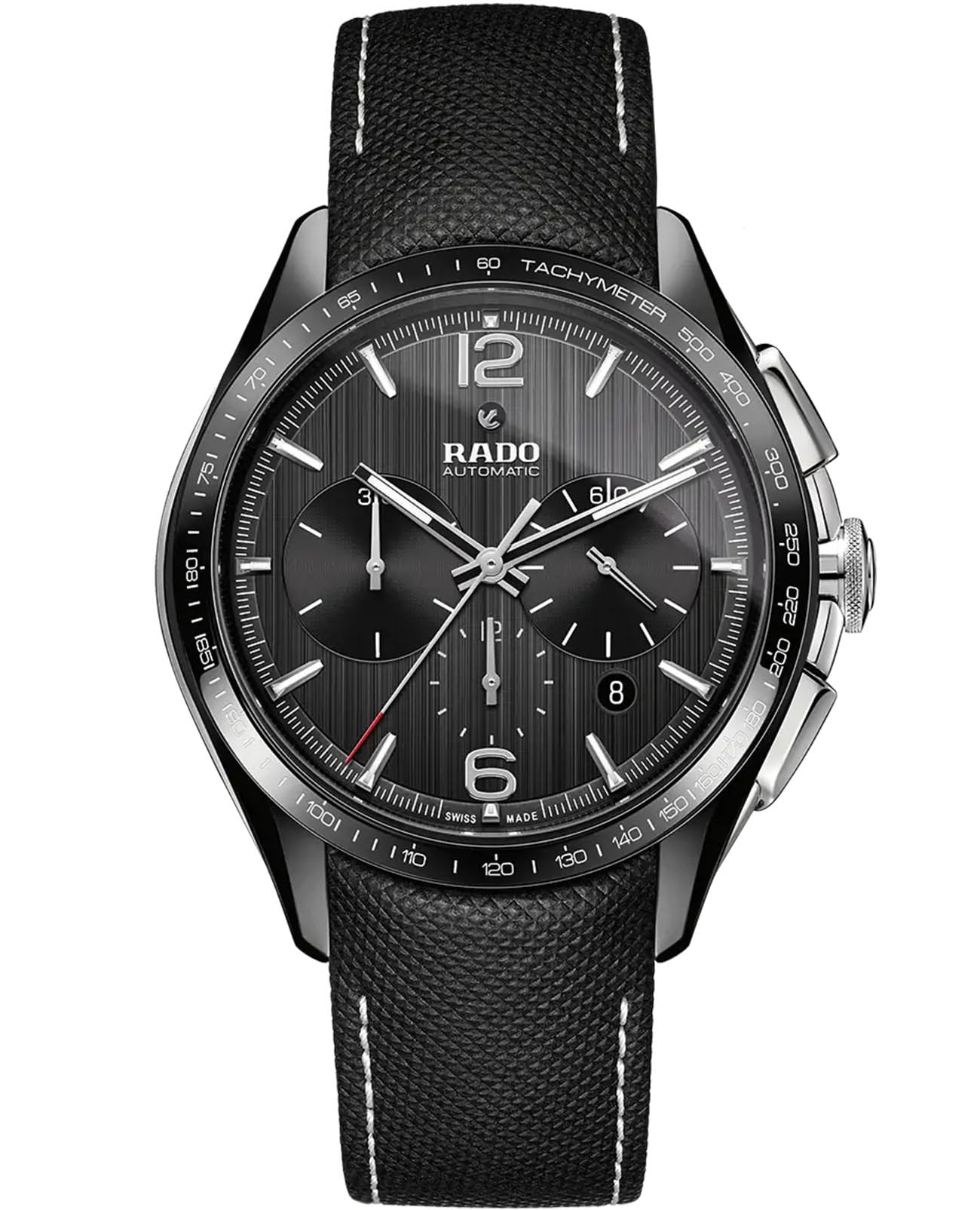Мужские швейцарские часы-хронографХронографФункция позволяет измерять отрезки времени с особой точностью: часы, минуты, секунды. Верным признаком хронографа является наличие на циферблате 3 дополнительных окошек-счётчиков. Rado HyperChrome Automatic Chronograph R32121155. Корпус часов изготовлен из нержавеющей стали с PVD-покрытиемPVDУльтратонкое покрытие наносится в технике вакуумного напыления, сочетает в себе нитрид титана особой прочности со слоем золота или оксида хрома. Несёт в себе декоративную или защитную функцию. и высокотехнологичной керамикиВысокотехнологичная керамикаИнновационный запатентованный Rado материал с гладкой или матовой поверхностью. Керамика за счёт кристаллической структуры обладает повышенной устойчивостью от возникновения царапин. Материал способен принимать температуру тела человека, обеспечивая невероятный комфорт при ношении.. Тканевый ремешок на стандартной застёжке. Сапфировое стеклоСапфировое стеклоПрочный и надёжный материал из кристалла сапфира синтетического происхождения, характеризующийся особой твёрдостью и устойчивостью к царапинам и повреждениям. устойчивое к мелким механическим повреждениям. Стрелки и метки с люминесцентным покрытиемЛюминесцентное покрытиеПозволяет считывать показания времени в темноте. Производители наносят на стрелки, часовые индексы, безель или поверхность циферблата светонакопительный состав, дающий холодное свечение.. Окошко даты находится в положении между 4 и 5 часов. Класс водозащиты: 100 метров, позволит плавать, нырять и заниматься другими водными видами спорта. БезельБезельВнешний ободок, закрепляющий стекло. В спортивных часах так называется поворотное кольцо с делениями на циферблате, выполняет роль таймера – замеряет отрезки времени на шкале. Неподвижный безель – элемент декора. Однонаправленно вращающийся безель на дайверских часах позволяет фиксировать моменты погружения и выныривания на поверхность. со шкалой тахиметраТахиметрРазмеченная шкала, располагается на ободке или безеле часов. Тахиметр позволяет рассчитать скорость на определённом участке пути, расстояние измеряется в километрах или милях..