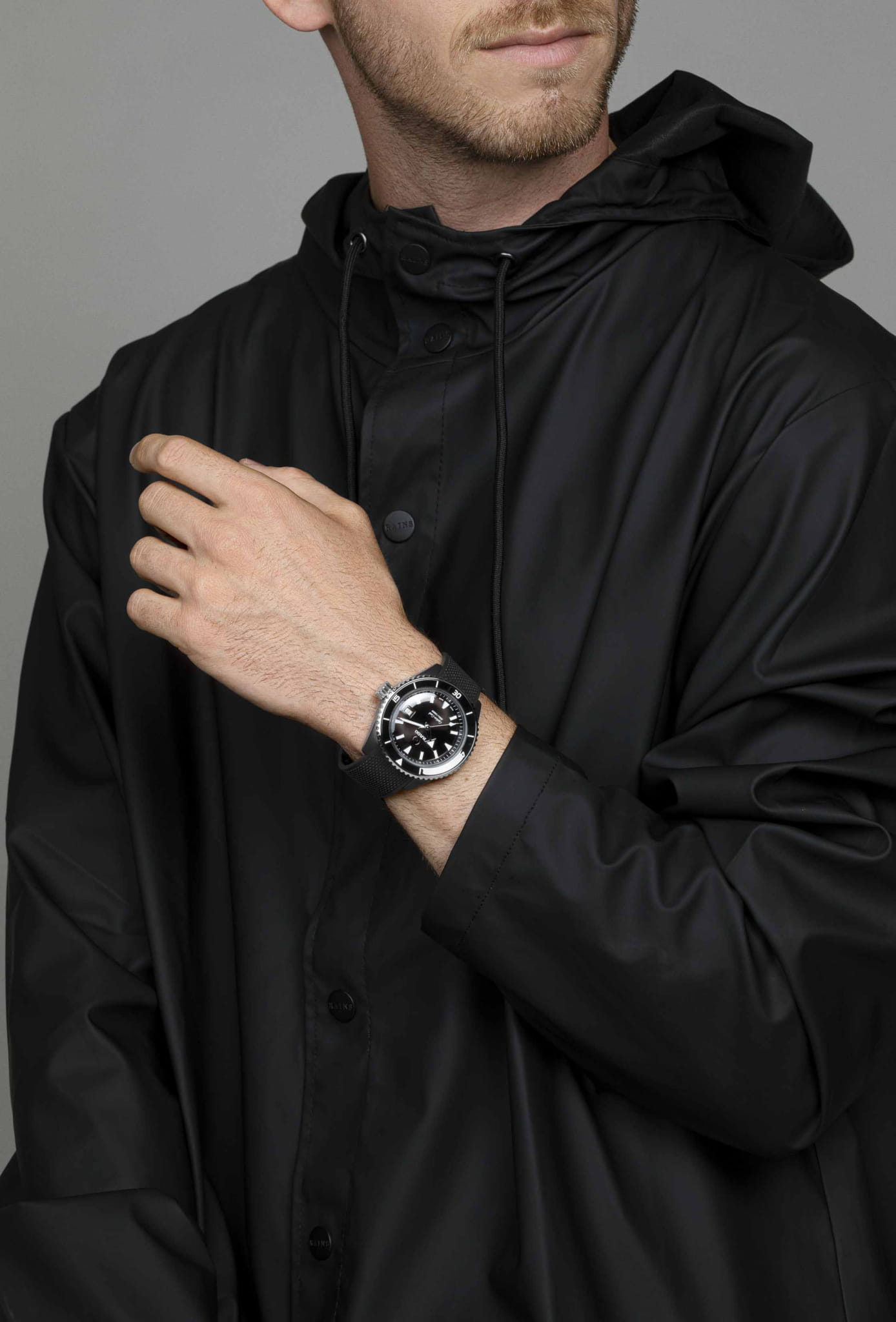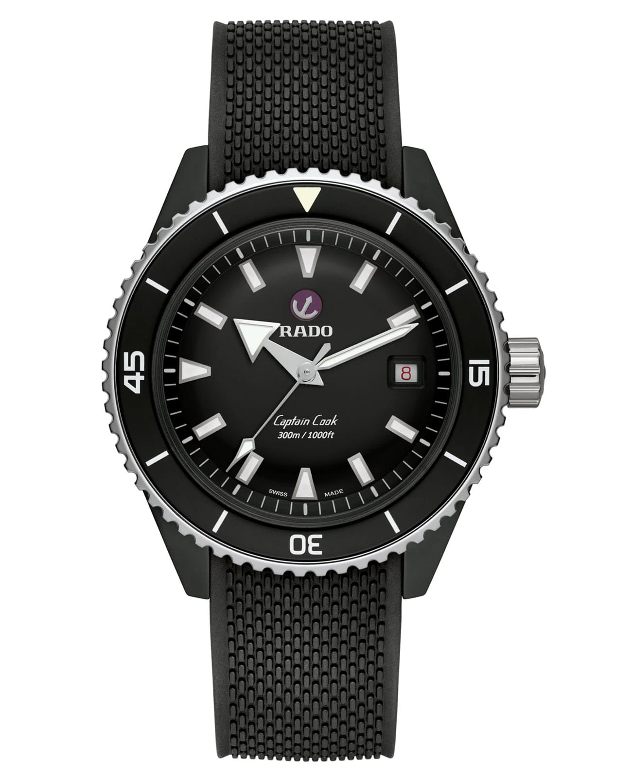 Высокотехнологичные керамические часы Captain Cook для дайверов (300 WR). Стрелки и индексы дайверских часов, сертифицированных по стандарту ISO 6425, покрыты SuperLuminova®, что обеспечивает отличную видимость на черном лакированном и полированном циферблате. 43-миллиметровый моноблочный корпус изготовлен из матовой черной высокотехнологичной керамикиВысокотехнологичная керамикаИнновационный запатентованный Rado материал с гладкой или матовой поверхностью. Керамика за счёт кристаллической структуры обладает повышенной устойчивостью от возникновения царапин. Материал способен принимать температуру тела человека, обеспечивая невероятный комфорт при ношении., а вращающийся безельБезельВнешний ободок, закрепляющий стекло. В спортивных часах так называется поворотное кольцо с делениями на циферблате, выполняет роль таймера – замеряет отрезки времени на шкале. Неподвижный безель – элемент декора. Однонаправленно вращающийся безель на дайверских часах позволяет фиксировать моменты погружения и выныривания на поверхность. - из полированной нержавеющей стали. Внутри механизм Rado R763 с автоподзаводом превосходит стандартные требования по проверке точности в 3-5 положениях и обеспечивает 80 часов запаса хода. Эта модель поставляется с матовым черным каучуковым ремешком. Какой бы ни была ваша область исследований, ваш высокотехнологичный керамический дайвер Captain Cook станет надежным партнером на долгие годы.