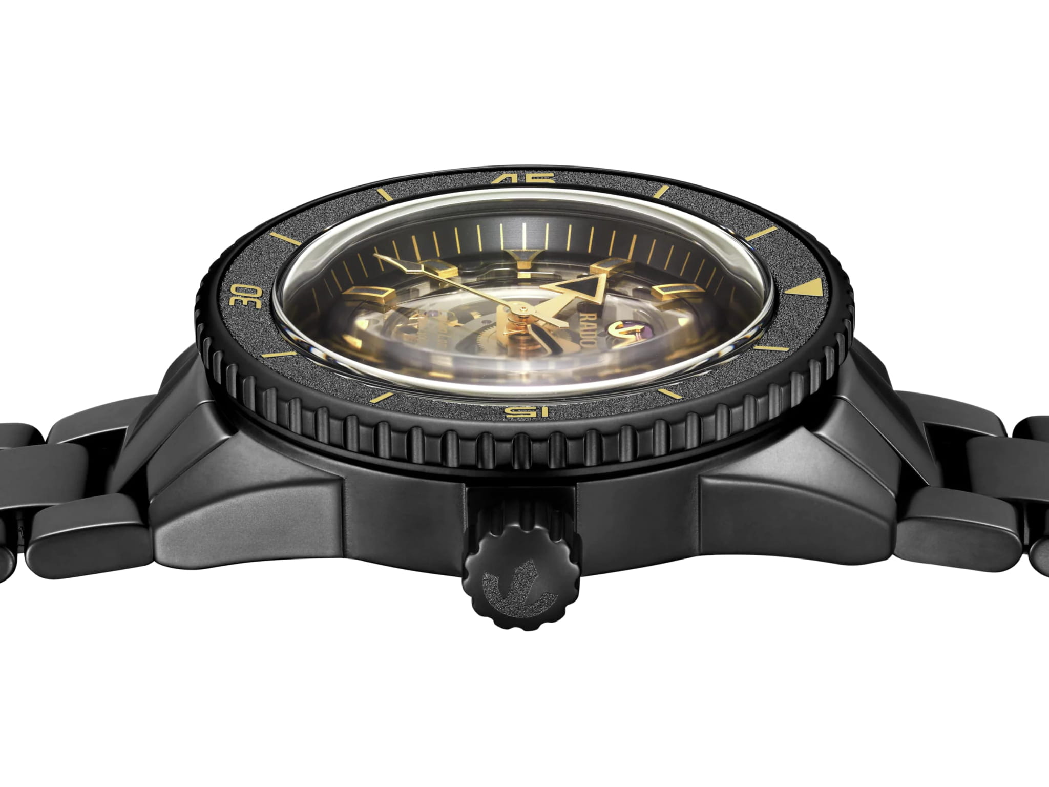 Captain Cook High-Tech Ceramic Limited Edition - это не только первые часы Rado с совершенно новым калибром R808, но и первая модель Captain Cook с высокотехнологичными керамическими вставками с антидактилоскопической структурой. Кроме того, впервые весь безель и заводная головка выполнены из высокотехнологичной керамикиВысокотехнологичная керамикаИнновационный запатентованный Rado материал с гладкой или матовой поверхностью. Керамика за счёт кристаллической структуры обладает повышенной устойчивостью от возникновения царапин. Материал способен принимать температуру тела человека, обеспечивая невероятный комфорт при ношении.. Трехручный механизм превосходит стандартные требования к точности испытаний с 3 до 5 положений благодаря антимагнитной пружине Nivachron™Nivachron™Специально разработанный инновационный сплав Nivachron™ повышает устойчивость часов к воздействию магнитных полей.. Эти культовые часы диаметром 43 мм водонепроницаемы до 300 м и имеют запас хода 80 часов. Наряду с матово-черным высокотехнологичным керамическим корпусом и его сапфировое стеклоСапфировое стеклоПрочный и надёжный материал из кристалла сапфира синтетического происхождения, характеризующийся особой твёрдостью и устойчивостью к царапинам и повреждениям. с дымовой тонировкой, дизайн показывает этот бескомпромиссный характер в соответствии с хорошо известной, узнаваемой традицией Капитана Кука. Красиво завершает дизайн матово-черный браслет из высокотехнологичной керамики, с титановой тройной застежкой, оснащенной керамическими кнопками. Часы ограничены 1962 экземплярами с последовательными номерами.