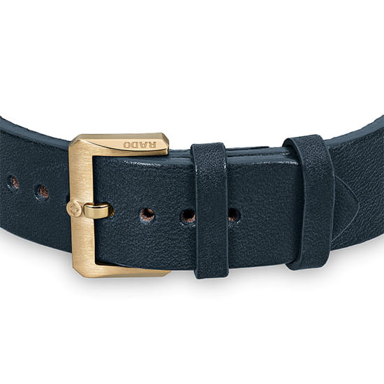 Часы выполнены в классическом дизайне, модель останется актуальной на долгие годы. Синий циферблат «солнечные лучи» дополнен контрастными цифрами. Премиальный аксессуар имеет роскошный корпус – он выполнен из бронзы и высокотехнологичной керамикиВысокотехнологичная керамикаИнновационный запатентованный Rado материал с гладкой или матовой поверхностью. Керамика за счёт кристаллической структуры обладает повышенной устойчивостью от возникновения царапин. Материал способен принимать температуру тела человека, обеспечивая невероятный комфорт при ношении.. Безупречную точность хода регулирует швейцарский автоматический калибр ETA C07.611 с запасом хода до 80 часов. Антибликовое покрытие сапфирового стекла улучшает читаемость показаний. Стрелки и метки дополнены люминесцентным покрытиемЛюминесцентное покрытиеПозволяет считывать показания времени в темноте. Производители наносят на стрелки, часовые индексы, безель или поверхность циферблата светонакопительный состав, дающий холодное свечение.. Ремешок сделан из натуральной кожи. Закручивающаяся задняя крышка и завинчивающаяся заводная головка усиливают водостойкость модели до 20 бар. На метке 3 часов расположена апертура даты. Диаметр корпуса: 42 мм.