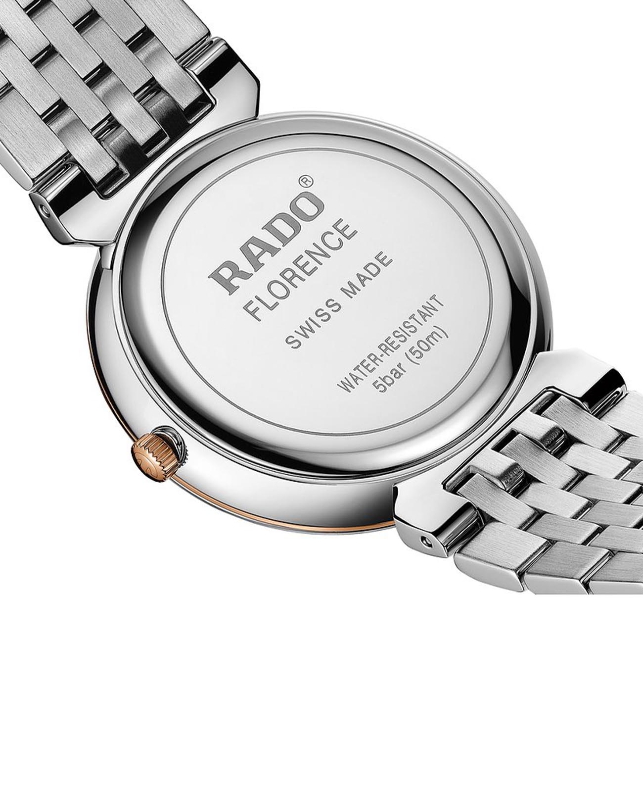 Швейцарские наручные часы с надёжным кварцевым механизмом Rado Florence Classic R48912403. Корпус часов изготовлен из нержавеющей стали. Сапфировое стеклоСапфировое стеклоПрочный и надёжный материал из кристалла сапфира синтетического происхождения, характеризующийся особой твёрдостью и устойчивостью к царапинам и повреждениям. с антибликовым покрытиемАнтибликовое покрытиеСлой оксида металла в 0,13-0,3 микрон, благодаря которому стекло часов не бликует и не отражает свет. Антибликовое покрытие уменьшает отражение света в 10 раз, обеспечивая отличную читаемость показателей циферблата., устойчивое к мелким механическим повреждениям. Стальной браслет на застёжке-бабочке с кнопкамиЗастёжка "бабочка"Такой вид застёжки дополняется предохранителями, помогающими избежать случайного раскрытия браслета. Обладают изящным исполнением. с частичным PVD-покрытиемPVDУльтратонкое покрытие наносится в технике вакуумного напыления, сочетает в себе нитрид титана особой прочности со слоем золота или оксида хрома. Несёт в себе декоративную или защитную функцию.. Класс водозащиты: 50 метров, позволит защитить корпус от случайных брызг или капель дождя. Окошко даты находится в положении 6 часов.