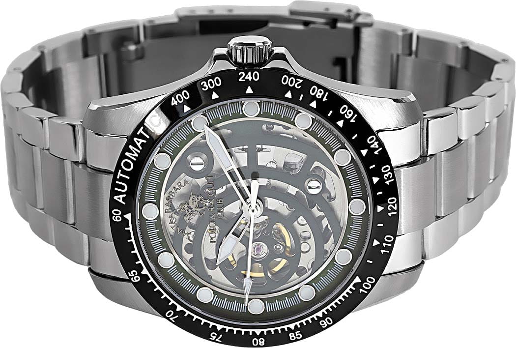 Мужские механические часы с автоподзаводом Santa Barbara Polo & Racquet Club — это эффектный аксессуар с оригинальным дизайном. Корпус диаметром 42 мм и высотой 49,5 мм выполнен из стали. БезельБезельВнешний ободок, закрепляющий стекло. В спортивных часах так называется поворотное кольцо с делениями на циферблате, выполняет роль таймера – замеряет отрезки времени на шкале. Неподвижный безель – элемент декора. Однонаправленно вращающийся безель на дайверских часах позволяет фиксировать моменты погружения и выныривания на поверхность. из стали с IP-покрытиемIP-покрытиеМетод ионного напыления. Демонстрирует повышенную устойчивость к истиранию, окислению и химическим веществам. Под воздействием высокого давления и температуры около 1500°C молекулы металла надёжно соединяются с частицами корпуса часов.. Циферблат зелёного цвета частично скелетонизирован, что позволяет наблюдать за работой механизма. Двухуровневый циферблат украшен накладными метками в виде точек и фирменным логотипом. Стрелки и метки с люминесцентным покрытиемЛюминесцентное покрытиеПозволяет считывать показания времени в темноте. Производители наносят на стрелки, часовые индексы, безель или поверхность циферблата светонакопительный состав, дающий холодное свечение., обеспечивающим хорошую читаемость в темноте. Циферблат защищён минеральным стекломМинеральное стеклоМинеральное стекло представляет собой искусственно выращенный минерал кварца. Такое стекло отличается особой устойчивостью к повреждениям и царапинам. Уступает по некоторым качествам сапфировому стеклу.. Прозрачная задняя крышка открывает вид на механизм. Часы оснащены стальным браслетом с раскладной застёжкойРаскладная застёжкаТакой тип застёжки используется только на браслетах из металла. Она никогда не раскрывается полностью, происходит разделение на 2 и более частей. Раскладывающая застёжка снизит вероятность потери часов к минимуму.. Водонепроницаемость 50 м позволяет использовать часы в повседневных условиях. Идеальный выбор для тех, кто ценит технологичность, стиль и выразительность.