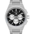 Мужские кварцевые часы Santa Barbara Polo & Racquet Club — это выразительный и функциональный аксессуар. Корпус диаметром 42 мм выполнен из нержавеющей стали 316L. Циферблат чёрного цвета оформлен по технологии Sunray («солнечные лучи»), дополнен накладными метками в виде штрихов и фирменным логотипом. Окошко даты расположено между 4 и 5 часами. Присутствует индикация 24-часового формата времени. Стрелки мечевидной формы и метки с люминесцентным покрытиемЛюминесцентное покрытиеПозволяет считывать показания времени в темноте. Производители наносят на стрелки, часовые индексы, безель или поверхность циферблата светонакопительный состав, дающий холодное свечение., обеспечивающим хорошую читаемость в темноте. Циферблат защищён минеральным стекломМинеральное стеклоМинеральное стекло представляет собой искусственно выращенный минерал кварца. Такое стекло отличается особой устойчивостью к повреждениям и царапинам. Уступает по некоторым качествам сапфировому стеклу.. Часы оснащены стальным браслетом на застёжке «бабочка» с кнопкамиЗастёжка "бабочка"Такой вид застёжки дополняется предохранителями, помогающими избежать случайного раскрытия браслета. Обладают изящным исполнением. . Водонепроницаемость 50 м позволяет использовать часы в повседневных условиях. Идеальный выбор для тех, кто ценит стиль, точность и надёжность.