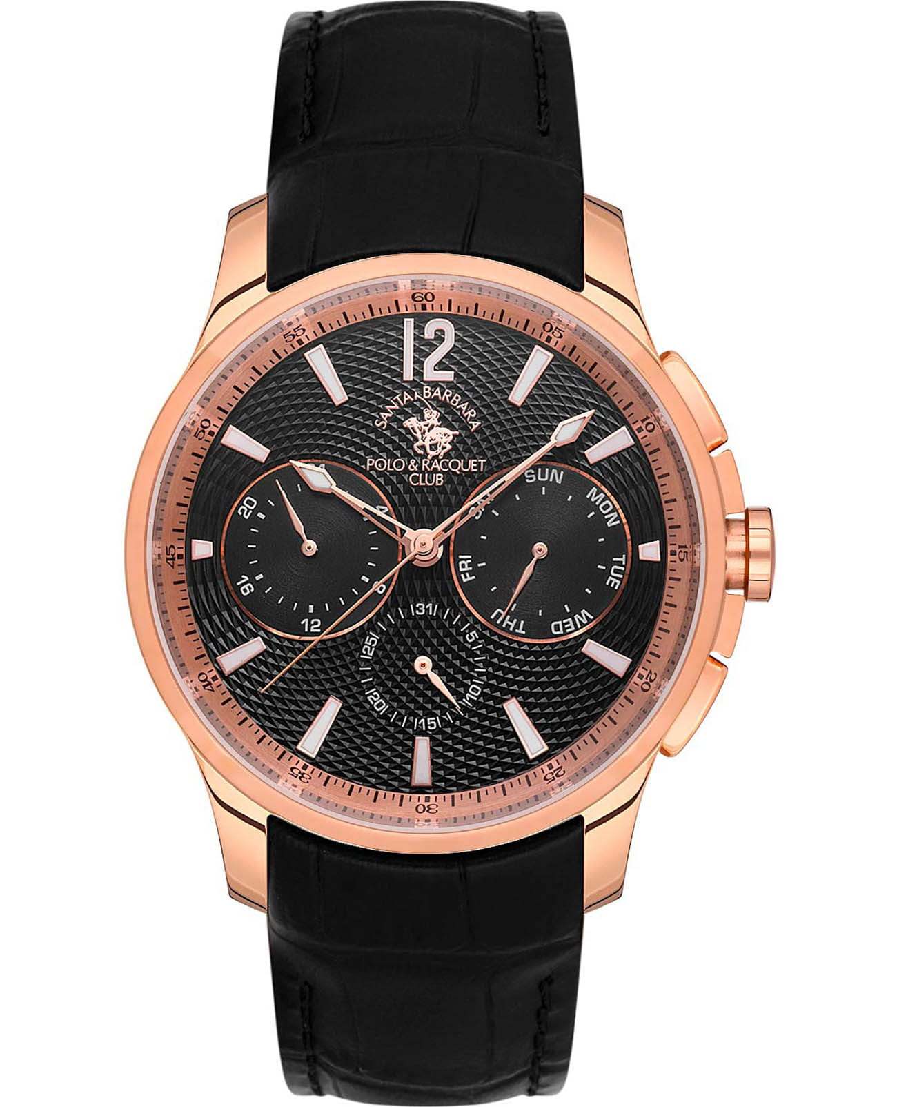 Мужские кварцевые часы Santa Barbara Polo & Racquet Club — это идеальный выбор для тех, кто ценит практичность и стиль. Корпус диаметром 43 мм выполнен из нержавеющей стали 316L с IP-покрытиемIP-покрытиеМетод ионного напыления. Демонстрирует повышенную устойчивость к истиранию, окислению и химическим веществам. Под воздействием высокого давления и температуры около 1500°C молекулы металла надёжно соединяются с частицами корпуса часов. розового золота и полированной отделкой. Циферблат чёрного цвета украшен узором и фирменным логотипом, дополнен накладными метками в виде штрихов и арабской цифрой 12. Указатели дня недели и даты вынесены на отдельные субциферблаты, также присутствует индикация 24-часового формата времени. Стрелки и метки с люминесцентным покрытиемЛюминесцентное покрытиеПозволяет считывать показания времени в темноте. Производители наносят на стрелки, часовые индексы, безель или поверхность циферблата светонакопительный состав, дающий холодное свечение., обеспечивающим хорошую читаемость в темноте. Циферблат защищён минеральным стекломМинеральное стеклоМинеральное стекло представляет собой искусственно выращенный минерал кварца. Такое стекло отличается особой устойчивостью к повреждениям и царапинам. Уступает по некоторым качествам сапфировому стеклу.. Часы оснащены кожаным ремешком на застёжке «бабочка» с кнопкамиЗастёжка "бабочка"Такой вид застёжки дополняется предохранителями, помогающими избежать случайного раскрытия браслета. Обладают изящным исполнением. . Водонепроницаемость 50 м позволяет использовать часы в повседневных условиях. Идеальный выбор для тех, кто ценит классический дизайн, точность и надёжность..