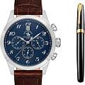 Мужские кварцевые Santa Barbara Polo & Racquet Club SB.1.10551-2 — воплощение элегантности и технического совершенства. Корпус из нержавеющей стали серебристого цвета, диаметром 43 мм, что делает их устойчивыми к внешним воздействиям и придает благородный вид. Циферблат украшен фирменным логотипом и защищён минеральным стекломМинеральное стеклоМинеральное стекло представляет собой искусственно выращенный минерал кварца. Такое стекло отличается особой устойчивостью к повреждениям и царапинам. Уступает по некоторым качествам сапфировому стеклу., устойчивое к царапинам и механическим повреждениям. Кожаный ремешок на стандартной застежке обеспечивает комфортное и безопасное ношение. Рифленая заводная головка. 12-ти и 24-х часовой формат. Окошко даты находится в положении 12 часов. Водонепроницаемость 50 метров позволит защитить корпус от случайных брызг или капель дождя. Идеальный выбор для тех, кто ценит элегантный дизайн и качество. Подарочный набор - функциональные мужские часы и ручка.