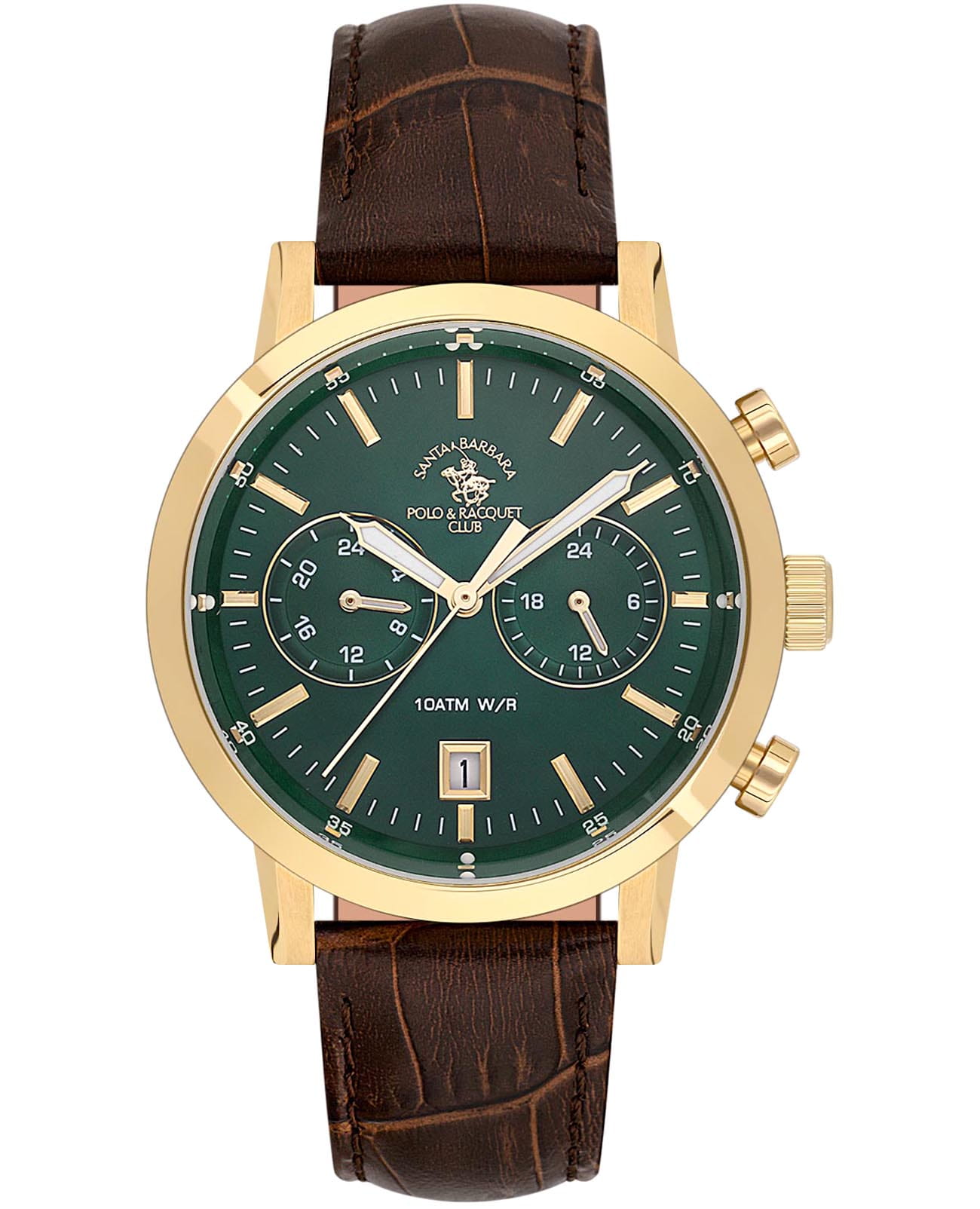 Мужские кварцевые Santa Barbara Polo & Racquet Club SB.1.10586-4 — воплощение элегантности и технического совершенства. Корпус из нержавеющей стали с IP-покрытиемIP-покрытиеМетод ионного напыления. Демонстрирует повышенную устойчивость к истиранию, окислению и химическим веществам. Под воздействием высокого давления и температуры около 1500°C молекулы металла надёжно соединяются с частицами корпуса часов. золотистого цвета, диаметром 41,5 мм, что делает их устойчивыми к внешним воздействиям и придает благородный вид. Циферблат украшен фирменным логотипом и защищён минеральным стекломМинеральное стеклоМинеральное стекло представляет собой искусственно выращенный минерал кварца. Такое стекло отличается особой устойчивостью к повреждениям и царапинам. Уступает по некоторым качествам сапфировому стеклу., устойчивое к царапинам и механическим повреждениям. Кожаный ремешок на застёжке-бабочке с кнопкамиЗастёжка "бабочка"Такой вид застёжки дополняется предохранителями, помогающими избежать случайного раскрытия браслета. Обладают изящным исполнением. обеспечивает комфортное и безопасное ношение. Стрелки с люминесцентным покрытиемЛюминесцентное покрытиеПозволяет считывать показания времени в темноте. Производители наносят на стрелки, часовые индексы, безель или поверхность циферблата светонакопительный состав, дающий холодное свечение., которое светится в темноте после непродолжительной зарядки на свету. Рифленая заводная головка. Второй часовой поясВторой часовой поясФункция, позволяющая отображать время двух часовых поясов одновременно.. 12-ти и 24-х часовой формат. Окошко даты находится в положении 6 часов. Водонепроницаемость 100 метров позволит плавать, нырять и заниматься другими водными видами спорта. Идеальный выбор для тех, кто ценит элегантный дизайн и качество.
