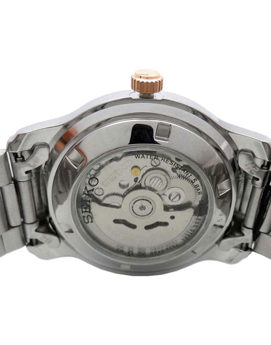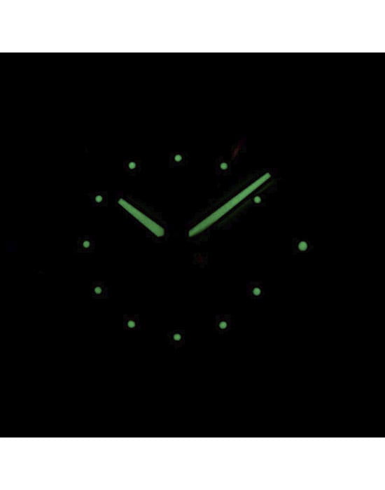 Наручные часы выполнены в классическом стиле, спортивные элементы делают акцент на надёжности и функциональности модели. Традиционный характер выражается в оснащении аксессуара японским механизмом Seiko 7S26 с возможностью ручного и автоматического завода. Калибр отличается сохранением запаса хода на 40 часов, его работу можно отследить через прозрачную завинчивающуюся заднюю крышку. В качестве основного материала была выбрана хирургическая сталь 316L с частичным PVD-покрытиемPVDУльтратонкое покрытие наносится в технике вакуумного напыления, сочетает в себе нитрид титана особой прочности со слоем золота или оксида хрома. Несёт в себе декоративную или защитную функцию., характеризующаяся устойчивостью к царапинам, повреждениям. Защиту циферблата обеспечивает прочное минеральное стекло Hardlex. На стрелки и метки нанесено яркое люминесцентное покрытиеЛюминесцентное покрытиеПозволяет считывать показания времени в темноте. Производители наносят на стрелки, часовые индексы, безель или поверхность циферблата светонакопительный состав, дающий холодное свечение.. Водостойкость при давлении до 5 бар позволяет принимать душ в часах, они выдержат дождь или мойку машины. На позиции 3 часов размещено окошко даты и дня недели. Диаметр корпуса: 42,3 мм.