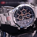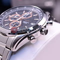 Хронограф с центральной секундной стрелкой (точность измерений 1/5 секунды), 60-минутный индикатор на «12 часах»и 12-часовой индикатор на «9 часах».