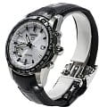 -сигнала для установки и корректировки точного времени, даты и часового пояса. Титановый корпус с фирменной зеркальной полировкой Зарацу. БезельБезельВнешний ободок, закрепляющий стекло. В спортивных часах так называется поворотное кольцо с делениями на циферблате, выполняет роль таймера – замеряет отрезки времени на шкале. Неподвижный безель – элемент декора. Однонаправленно вращающийся безель на дайверских часах позволяет фиксировать моменты погружения и выныривания на поверхность. из керамики. Сапфировое стекло. Закручивающаяся задняя крышка. Водонепроницаемость 100 метров. Люминесцентное покрытие LumiBriteЛюминесцентное покрытиеПозволяет считывать показания времени в темноте. Производители наносят на стрелки, часовые индексы, безель или поверхность циферблата светонакопительный состав, дающий холодное свечение.. Застёжка с фиксатором препятствует случайному расстёгиванию ремешка из кожи крокодила. Вечный календарьВечный календарьКлассическое часовое усложнение, представляющее собой календарь, рассчитанный на несколько лет вперёд (стандартно – до 2099 года). Определяет текущую дату, день недели, месяц., функция мирового времениМировое время Полезное часовое усложнение, отображающее время в основных городах и известных областях по всему миру, оно связано с часовыми поясами, удобно для путешественников и бизнесменов. – 40 часовых поясов. Диаметр корпуса: 44,8 мм.