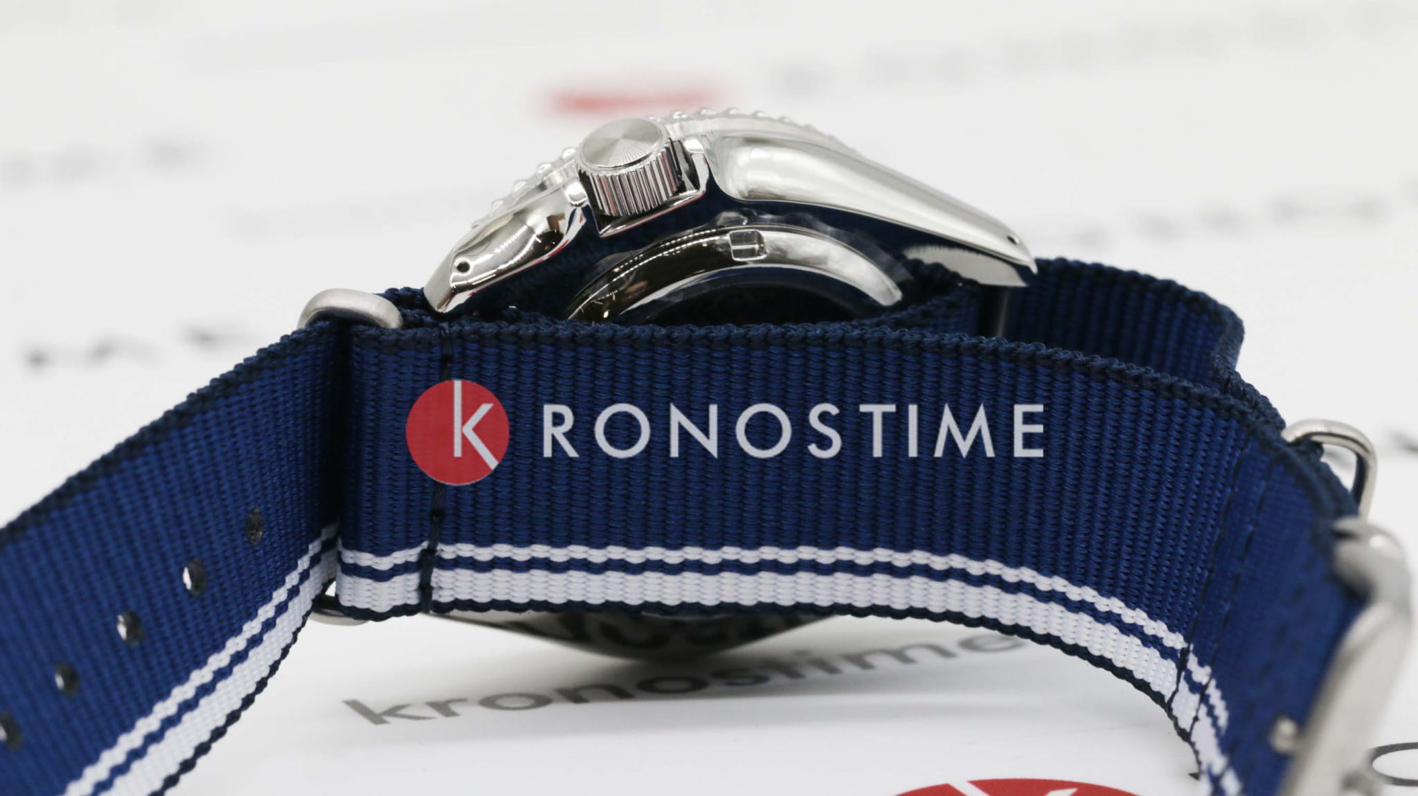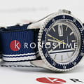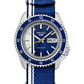 Водозащита 100 метров (10 бар) позволяет использовать часы для плавания и других водных видов спорта. Синий нейлоновый ремешок с белыми полосами и раскладной застёжкойРаскладная застёжкаТакой тип застёжки используется только на браслетах из металла. Она никогда не раскрывается полностью, происходит разделение на 2 и более частей. Раскладывающая застёжка снизит вероятность потери часов к минимуму. обеспечивает комфортное ношение и надёжную фиксацию на запястье.