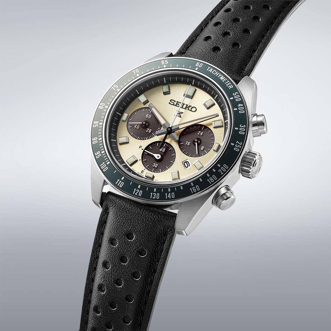Модель Seiko SSC943P1 из коллекции Prospex Speedtimer — это стильный солнечный хронограф с винтажными акцентами и точной функциональностью. Корпус диаметром 41,4 мм выполнен из нержавеющей стали и обеспечивает водозащиту до 100 метров благодаря завинчивающейся задней крышке и головке. Алюминиевый фиксированный тахиметрический безельТахиметрРазмеченная шкала, располагается на ободке или безеле часов. Тахиметр позволяет рассчитать скорость на определённом участке пути, расстояние измеряется в километрах или милях. позволяет измерять скорость по пройденной дистанции. Циферблат нежного кремового оттенка дополнен тремя тёмно-синими счётчиками: 60-минутным хронографомХронографФункция позволяет измерять отрезки времени с особой точностью: часы, минуты, секунды. Верным признаком хронографа является наличие на циферблате 3 дополнительных окошек-счётчиков., 24-часовым индикатором и малой секундной стрелкой. Метки и стрелки покрыты люминесцентным покрытиемЛюминесцентное покрытиеПозволяет считывать показания времени в темноте. Производители наносят на стрелки, часовые индексы, безель или поверхность циферблата светонакопительный состав, дающий холодное свечение. LumiBrite, что обеспечивает высокую читаемость даже в темноте. Циферблат защищён выпуклым сапфировым стекломСапфировое стеклоПрочный и надёжный материал из кристалла сапфира синтетического происхождения, характеризующийся особой твёрдостью и устойчивостью к царапинам и повреждениям. с антибликовым покрытиемАнтибликовое покрытиеСлой оксида металла в 0,13-0,3 микрон, благодаря которому стекло часов не бликует и не отражает свет. Антибликовое покрытие уменьшает отражение света в 10 раз, обеспечивая отличную читаемость показателей циферблата., устойчивым к бликам и царапинам. Внутри установлен солнечный кварцевый калибр V192, обеспечивающий точность ±15 секунд в месяц и до 6 месяцев работы без подзарядки. Модель комплектуется чёрным перфорированным кожаным ремешком в стиле «rally» и оснащена надёжной стандартной застежкой. Seiko SSC943P1 — это современный хронограф в духе ретро-автоспорта: функциональный, точный и визуально привлекательный.