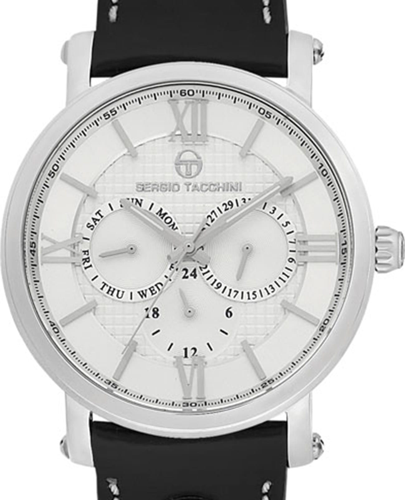 Мужские кварцевые часы Sergio Tacchini из коллекции City — это стильный аксессуар с классическими чертами для уверенного покорения городской жизни. Корпус диаметром 46 мм выполнен из нержавеющей стали 316L. Циферблат серебристого цвета оформлен индексами и стрелками. Указатели дня недели и даты вынесены на отдельные субциферблаты, также присутствует индикация 24-часового формата времени. Циферблат защищён минеральным стекломМинеральное стеклоМинеральное стекло представляет собой искусственно выращенный минерал кварца. Такое стекло отличается особой устойчивостью к повреждениям и царапинам. Уступает по некоторым качествам сапфировому стеклу. с антибликовым покрытиемАнтибликовое покрытиеСлой оксида металла в 0,13-0,3 микрон, благодаря которому стекло часов не бликует и не отражает свет. Антибликовое покрытие уменьшает отражение света в 10 раз, обеспечивая отличную читаемость показателей циферблата.. Механизм — японский кварцевый калибр Miyota 6P29. Часы оснащены кожаным ремешком чёрного цвета с стандартной. Водонепроницаемость 100 м позволяет использовать часы в повседневных условиях и для плавания. Идеальный выбор для тех, кто ценит функциональность и элегантный дизайн.