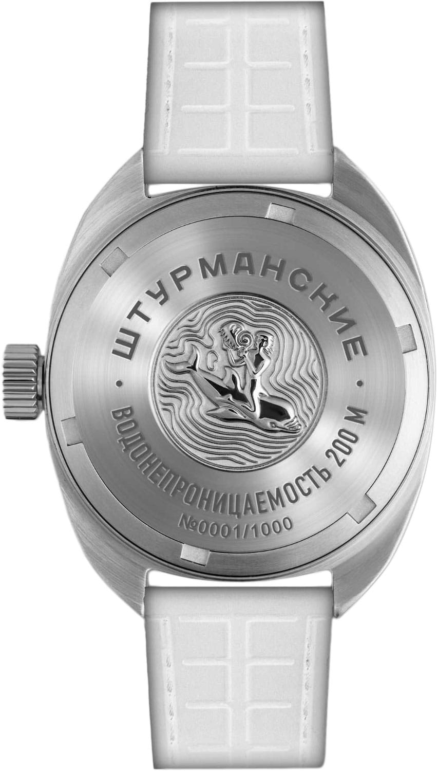 Штурманские мужские российские механические часы с утолщённым сферическим минеральным стекломМинеральное стеклоМинеральное стекло представляет собой искусственно выращенный минерал кварца. Такое стекло отличается особой устойчивостью к повреждениям и царапинам. Уступает по некоторым качествам сапфировому стеклу. Штурманские Амфибия 2416/7771300, механический механизм (автоматический калибр) с высокой точностью. Класс водозащиты: 200 метров, позволит плавать, нырять и заниматься другими водными видами спорта. Корпус часов изготовлен из стали. Силиконовый ремешок на стандартной застёжке. БезельБезельВнешний ободок, закрепляющий стекло. В спортивных часах так называется поворотное кольцо с делениями на циферблате, выполняет роль таймера – замеряет отрезки времени на шкале. Неподвижный безель – элемент декора. Однонаправленно вращающийся безель на дайверских часах позволяет фиксировать моменты погружения и выныривания на поверхность. с PVD-покрытиемPVDУльтратонкое покрытие наносится в технике вакуумного напыления, сочетает в себе нитрид титана особой прочности со слоем золота или оксида хрома. Несёт в себе декоративную или защитную функцию.. Стрелки и метки с люминесцентным покрытиемЛюминесцентное покрытиеПозволяет считывать показания времени в темноте. Производители наносят на стрелки, часовые индексы, безель или поверхность циферблата светонакопительный состав, дающий холодное свечение.. Окошко даты находится в положении 3 часа. Амфибия созданы на основе российского механического калибра с автоматическим подзаводом, 2416. На задней крышке – как дань исторической модели – рельефные изображения всадника на дельфине.