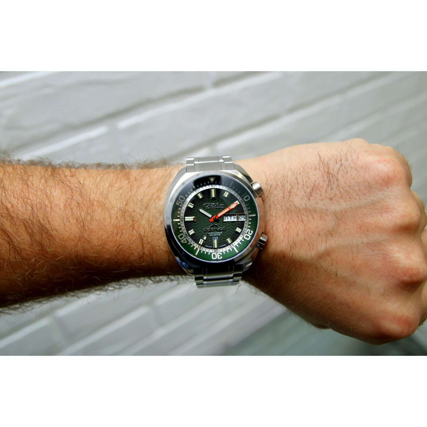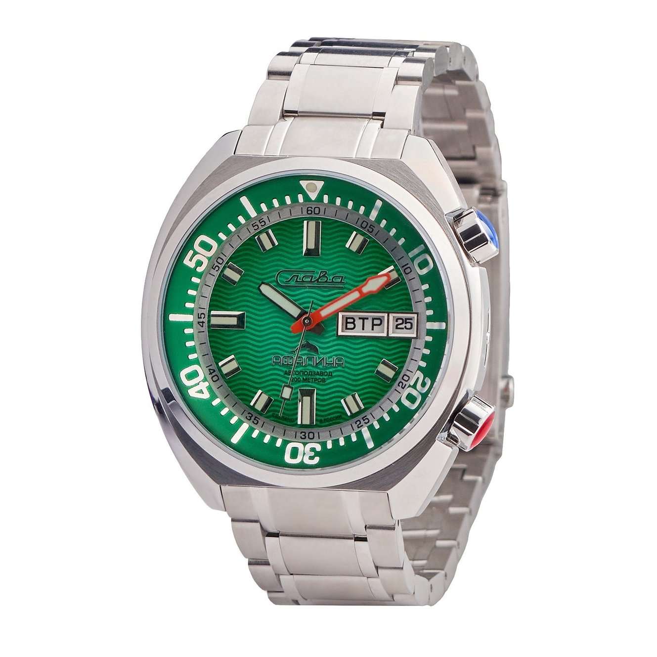 Коллекционные часы Слава Афалина 2430516/100-2427 — это превосходный выбор для тех, кто ценит стиль и функциональность. Модель из лимитированной серии, состоящей всего из 500 экземпляров, отличается прочным стальным корпусом и предназначена для любителей дайвинга. Часы оснащены надежным механическим механизмом с автоподзаводом и водозащитой до 200 метров, что делает их идеальными для подводных приключений. Зеленый циферблат дополняется стрелками с люминесцентным покрытиемЛюминесцентное покрытиеПозволяет считывать показания времени в темноте. Производители наносят на стрелки, часовые индексы, безель или поверхность циферблата светонакопительный состав, дающий холодное свечение. для отличной видимости в условиях низкой освещенности, а сапфировое стеклоСапфировое стеклоПрочный и надёжный материал из кристалла сапфира синтетического происхождения, характеризующийся особой твёрдостью и устойчивостью к царапинам и повреждениям. с антибликовым покрытиемАнтибликовое покрытиеСлой оксида металла в 0,13-0,3 микрон, благодаря которому стекло часов не бликует и не отражает свет. Антибликовое покрытие уменьшает отражение света в 10 раз, обеспечивая отличную читаемость показателей циферблата. защищает от царапин и бликов. Основная заводная головка расположена на корпусе ближе к отметке ''4 часа'', она позволяет настраивать время и заводить часы перед погружением. С помощью второй головки, расположенной у отметки ''2 часа'', можно управлять вращающимся внутренним кольцом безеляБезельВнешний ободок, закрепляющий стекло. В спортивных часах так называется поворотное кольцо с делениями на циферблате, выполняет роль таймера – замеряет отрезки времени на шкале. Неподвижный безель – элемент декора. Однонаправленно вращающийся безель на дайверских часах позволяет фиксировать моменты погружения и выныривания на поверхность. с PVDPVDУльтратонкое покрытие наносится в технике вакуумного напыления, сочетает в себе нитрид титана особой прочности со слоем золота или оксида хрома. Несёт в себе декоративную или защитную функцию. покрытием зеленого цвета и фиксировать его в нужном положении. Окошко даты и дня недели удобно расположено на отметке "3 часа", а профессиональная "дайвинг-застежка" стального браслета имеет удлинение для гидрокостюма. Особая забота о природе: часть средств от продажи данной модели перечисляется в центр спасения дельфинов "Дельфа". Часы серии "Афалина" — это не только функциональный аксессуар, но и символ вашей поддержки благородного дела.