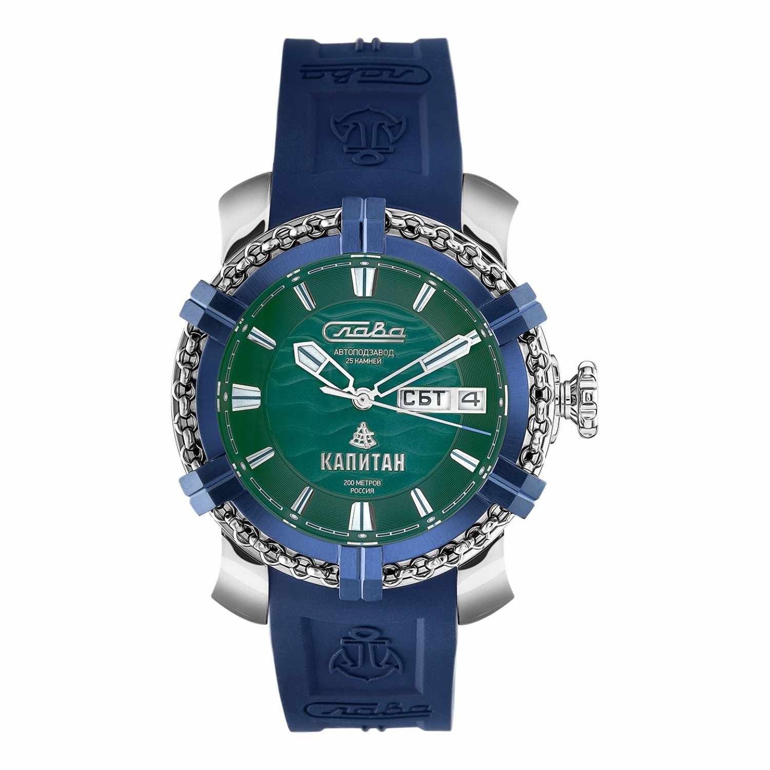 Российские механические наручные часы Слава Капитан 2470465/800-2427 — идеальный выбор для мужчин, ценящих стиль и надежность. Эта уникальная модель выпущена ограниченной серией в 500 экземпляров и сочетает в себе модный дизайн и высокое качество исполнения. Корпус часов выполнен из прочной стали и имеет диаметр 44 мм и толщину 16 мм, что придает им солидный и мужественный вид. БезельБезельВнешний ободок, закрепляющий стекло. В спортивных часах так называется поворотное кольцо с делениями на циферблате, выполняет роль таймера – замеряет отрезки времени на шкале. Неподвижный безель – элемент декора. Однонаправленно вращающийся безель на дайверских часах позволяет фиксировать моменты погружения и выныривания на поверхность. часов с IP-покрытиемIP-покрытиеМетод ионного напыления. Демонстрирует повышенную устойчивость к истиранию, окислению и химическим веществам. Под воздействием высокого давления и температуры около 1500°C молекулы металла надёжно соединяются с частицами корпуса часов. покрытием сине-серебристого цвета, выполненный в форме штурвала под стать названию коллекции "Капитан", придаёт часам неповторимый морской характер и стиль. Водозащита до 20 ATM позволяет использовать часы даже при погружении в воду, что делает их отличным выбором для активных мужчин. Зеленый циферблат с метками и сапфировое стеклоСапфировое стеклоПрочный и надёжный материал из кристалла сапфира синтетического происхождения, характеризующийся особой твёрдостью и устойчивостью к царапинам и повреждениям. обеспечивают долговечность и устойчивость к царапинам. Механический механизм "Слава 2427" с автоподзаводом и возможностью ручного подзавода гарантирует точность и надежность, а двойной календарь добавляет функциональности. На 3 часах расположено окошко с указателем даты и дня недели. Часы комплектуются прочным силиконовым ремешком со стандартной застежкой, обеспечивающим комфорт и надежную фиксацию на запястье. Задняя крышка крепится на 4-х винтах и украшена объемным изображением якоря. Индивидуальный серийный номер. Упакованы в стильную подарочную коробку из экокожи, они станут отличным подарком для любого особого случая. С часами Слава из коллекции Капитан вы подчеркнете свой статус и вкус, оставаясь верным российским традициям качества и стиля.