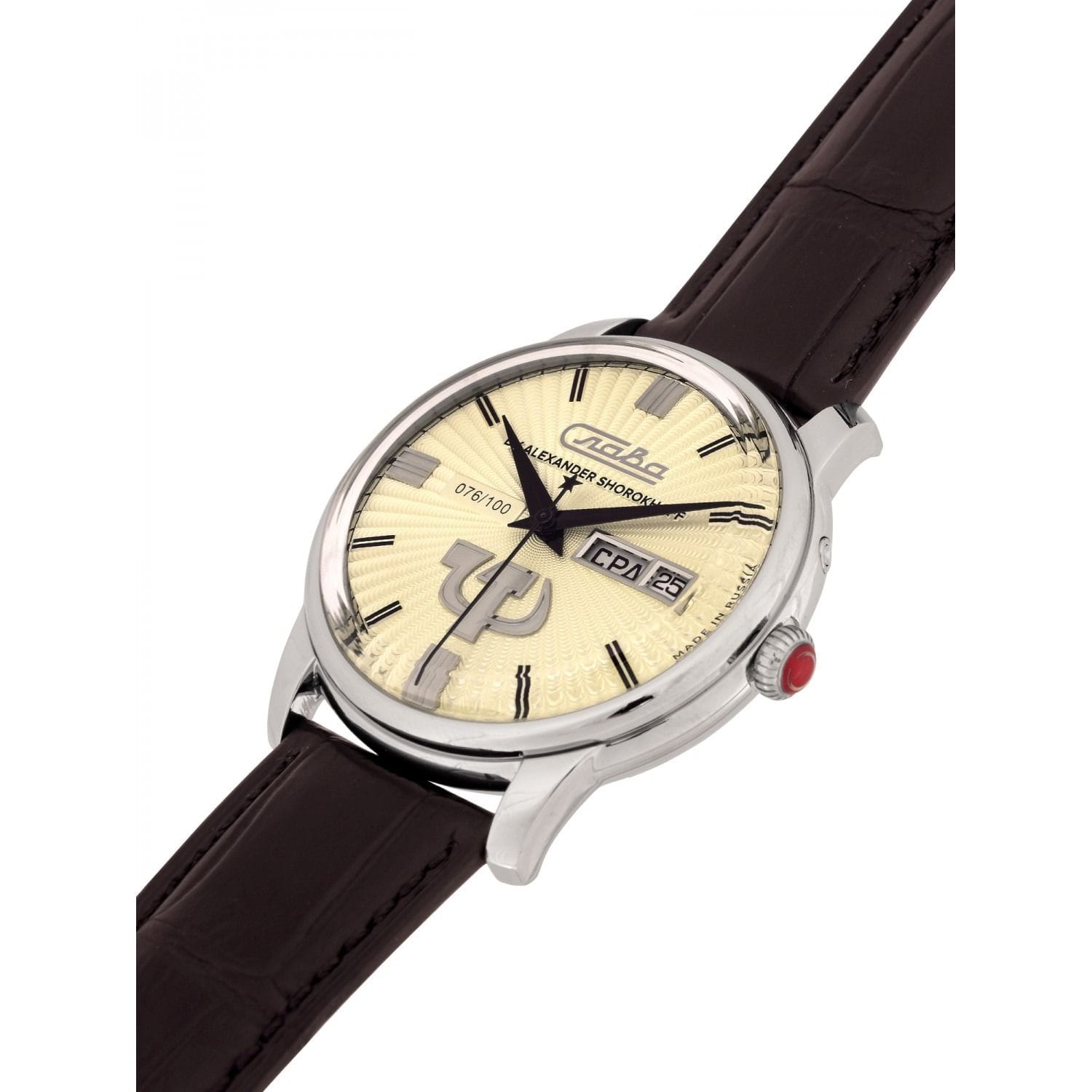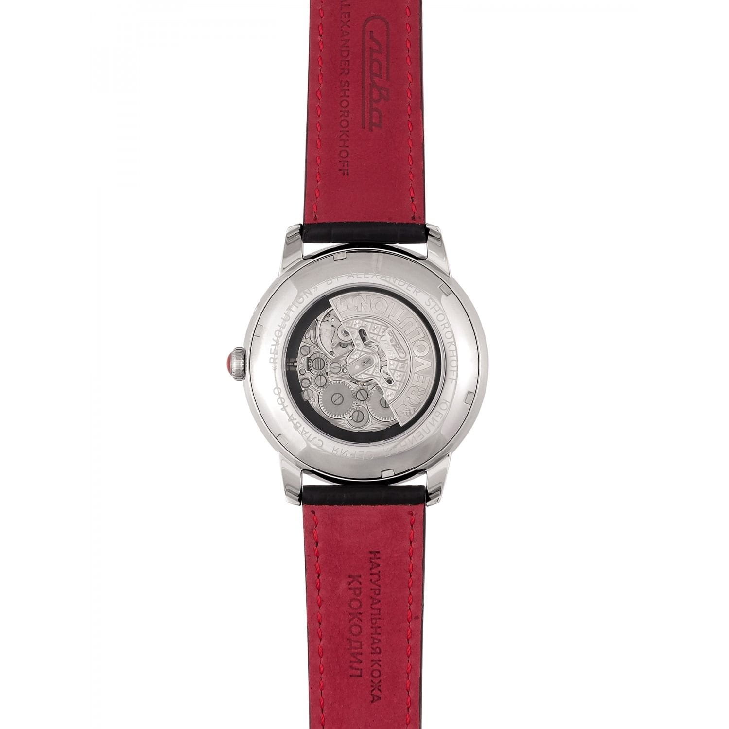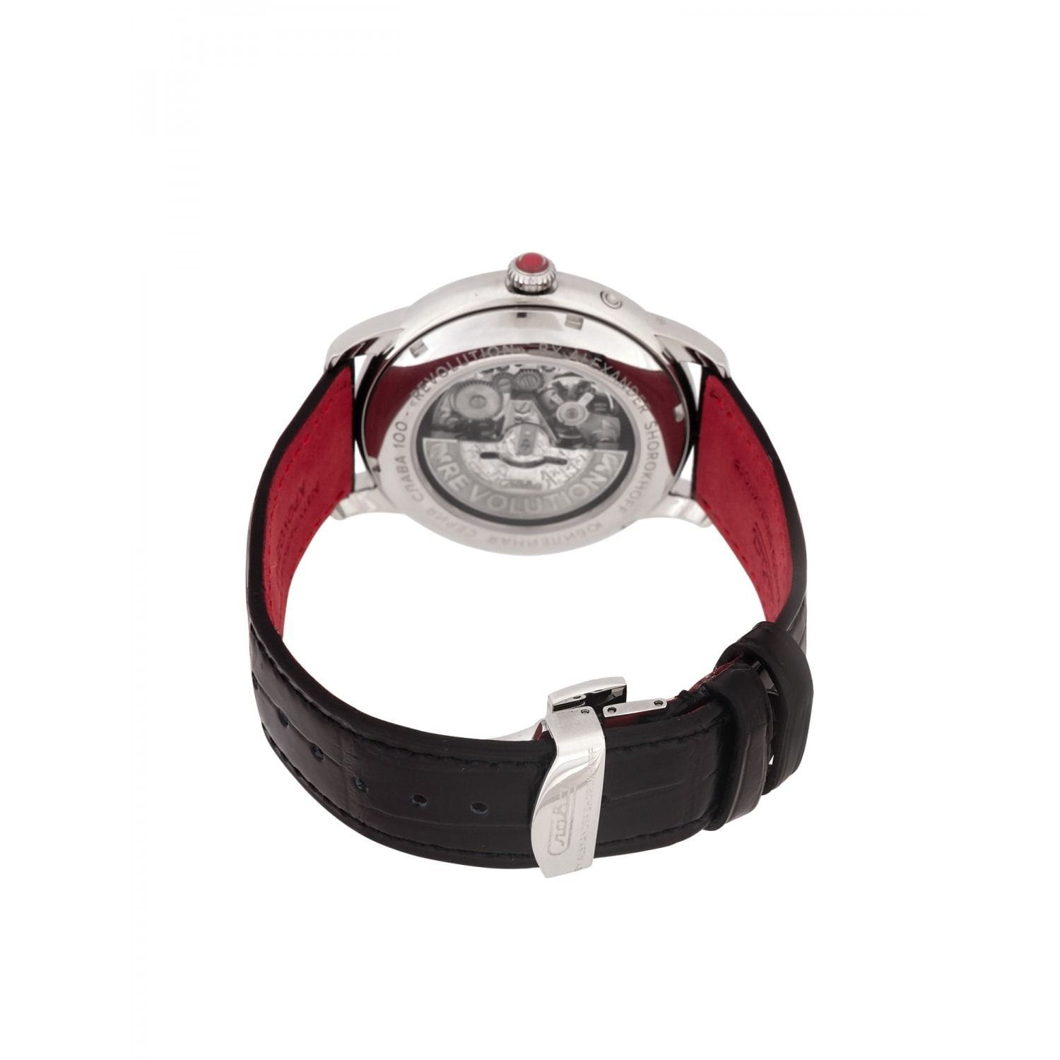 Российские механические часы с автоподзаводом Слава Революция 2600270/300-2427 созданы для тех, кто ценит стиль и надежность. Эта модель является плодом сотрудничества Часовой компании «Слава» и знаменитого мастера Александра Шорохова, который известен своим вкладом в возрождение российского часового мастерства и продвижение культуры в мире. Эти часы выполнены в соответствии с эскизами мастера, с использованием революционных символов — серпа и молота. Часы Слава «Революция» обладают механизмом с автоподзаводом «Слава 2427», украшенным ручной гравировкой, который можно наблюдать через прозрачную заднюю крышку. Этот механизм обеспечивает надежность и точность, а также добавляет элемент эксклюзивности. Корпус часов выполнен из стали и имеет серебристый оттенок, который гармонично сочетается с бежевым циферблатом. Диаметр корпуса составляет 44 мм, а толщина — 14,5 мм, что делает часы выразительными и комфортными для носки.  Сапфировое стеклоСапфировое стеклоПрочный и надёжный материал из кристалла сапфира синтетического происхождения, характеризующийся особой твёрдостью и устойчивостью к царапинам и повреждениям. защищает циферблат от царапин и обеспечивает долгий срок службы. Часы оснащены функцией двойного календаря, который отображает дату, что добавляет практичности в повседневной носке. Натуральный кожаный ремешок с застежкой «бабочка»Застёжка "бабочка"Такой вид застёжки дополняется предохранителями, помогающими избежать случайного раскрытия браслета. Обладают изящным исполнением. завершают образ, обеспечивая удобство и стиль. С водонепроницаемостью до 100 метров эти часы подходят для активного образа жизни, позволяя не беспокоиться о случайных контактах с водой, таких как плавание или дождь. Слава «Революция» выпускаются ограниченной серией — в трех видах по 100 штук.