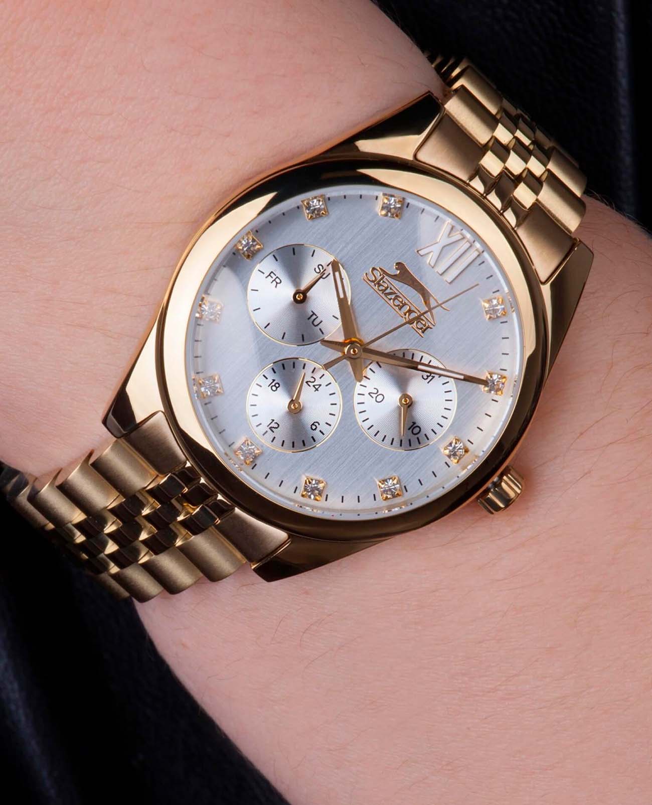 Женские наручные часы Slazenger SL.09.1990.4.04 сочетают в себе элегантный дизайн и практичность современных технологий. Модель обладает круглым корпусом диаметром 34 мм, изготовленным из суперметалла с IP-покрытиемIP-покрытиеМетод ионного напыления. Демонстрирует повышенную устойчивость к истиранию, окислению и химическим веществам. Под воздействием высокого давления и температуры около 1500°C молекулы металла надёжно соединяются с частицами корпуса часов., что обеспечивает высокую устойчивость к внешним воздействиям. Интегрированный браслет на пять звеньев выполнен из того же материала на раскладной застёжкеРаскладная застёжкаТакой тип застёжки используется только на браслетах из металла. Она никогда не раскрывается полностью, происходит разделение на 2 и более частей. Раскладывающая застёжка снизит вероятность потери часов к минимуму., гарантирующей комфортное ношение. Перламутровый циферблат оснащен индексами для лучшей читаемости времени и дополнен функцией отображения даты. Для защиты применяется минеральное стеклоМинеральное стеклоМинеральное стекло представляет собой искусственно выращенный минерал кварца. Такое стекло отличается особой устойчивостью к повреждениям и царапинам. Уступает по некоторым качествам сапфировому стеклу., обеспечивающее прочную защиту от царапин. Часы работают на японском кварцевом механизме, который питается от батарейки и гарантирует точное время без необходимости подзаводки. Водонепроницаемость составляет 3 атмосферы (30 метров), что позволяет использовать их в повседневной жизни, но не рекомендуется для плавания или занятий водными видами спорта.