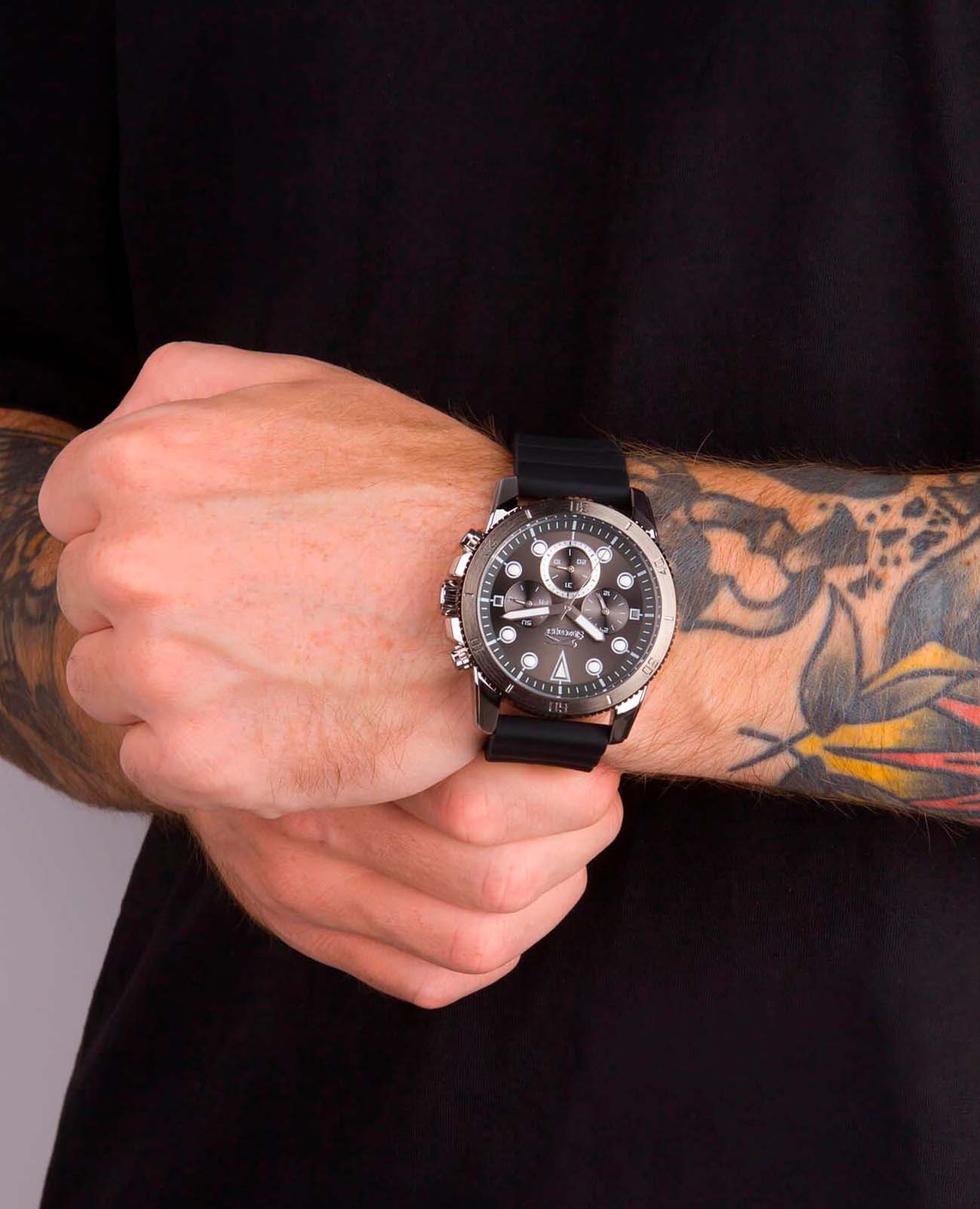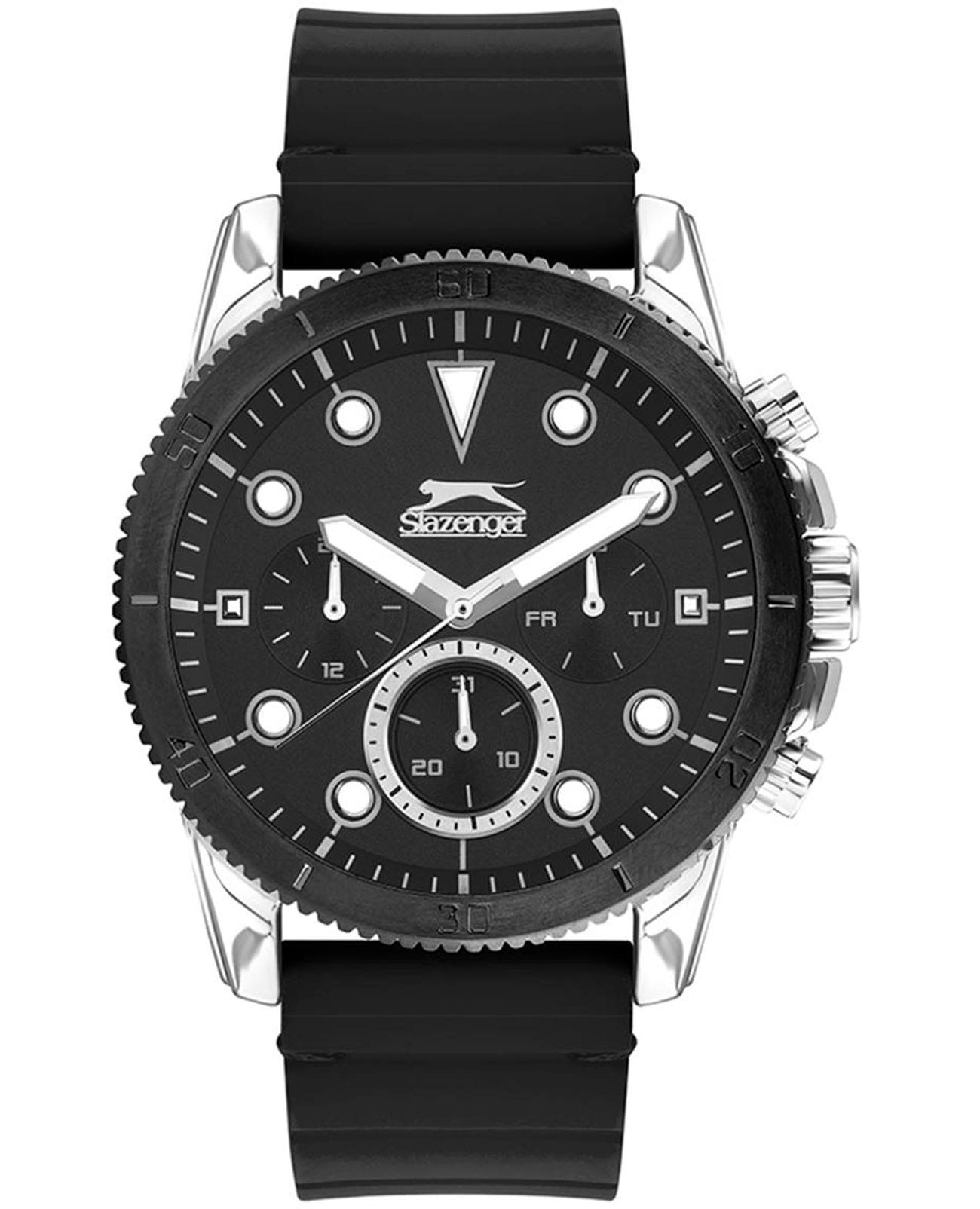 Мужские наручные часы Slazenger SL.09.2012.2.01 в себе классический дизайн и надежность современных технологий. Модель обладает круглым корпусом диаметром 47 мм и толщиной 13 мм, изготовленным из суперметалла , что обеспечивает высокую устойчивость к внешним воздействиям. БезельБезельВнешний ободок, закрепляющий стекло. В спортивных часах так называется поворотное кольцо с делениями на циферблате, выполняет роль таймера – замеряет отрезки времени на шкале. Неподвижный безель – элемент декора. Однонаправленно вращающийся безель на дайверских часах позволяет фиксировать моменты погружения и выныривания на поверхность. с IP-покрытиемIP-покрытиеМетод ионного напыления. Демонстрирует повышенную устойчивость к истиранию, окислению и химическим веществам. Под воздействием высокого давления и температуры около 1500°C молекулы металла надёжно соединяются с частицами корпуса часов.. Силиконовый ремешок на стандартной застежке гарантирует комфортное ношение и безопасность. Чёрный циферблат дополнен индексами и тремя малыми циферблатами для отображения даты, дня недели и текущего времени в формате 24 часа, а также защищен прочным минеральным стекломМинеральное стеклоМинеральное стекло представляет собой искусственно выращенный минерал кварца. Такое стекло отличается особой устойчивостью к повреждениям и царапинам. Уступает по некоторым качествам сапфировому стеклу. с люминесцентным покрытием для лучшей видимости в темноте. Часы работают на кварцевом механизме, что гарантирует точное время без необходимости подзаводки [[2]]. Водонепроницаемость часов достигает уровня WR50 (5 атмосфер), что позволяет использовать их во время плавания, однако не рекомендуется для глубоководного дайвинга. Вес часов составляет 102 грамма, что делает их удобными для длительного ношения.