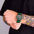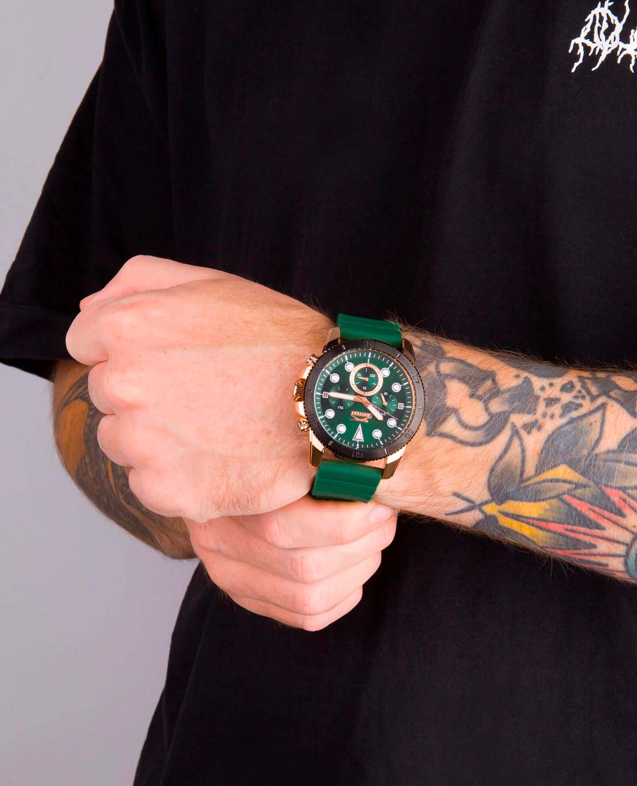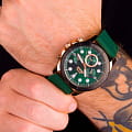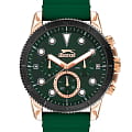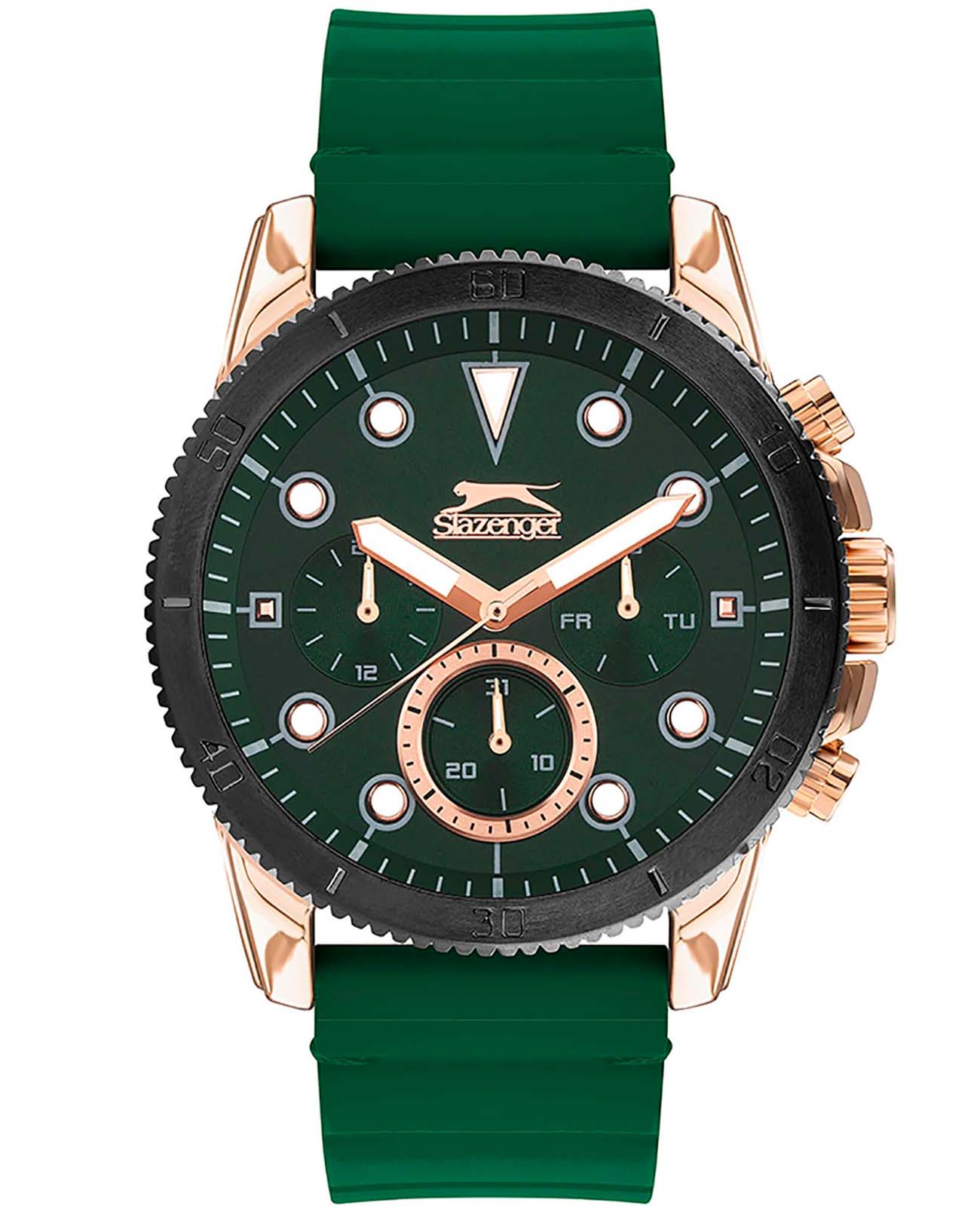 Мужские наручные часы Slazenger SL.09.2012.2.05 сочетают в себе спортивный дизайн и функциональность современных технологий. Модель обладает круглым корпусом диаметром 47 мм, изготовленным из суперметалла с IP-покрытиемIP-покрытиеМетод ионного напыления. Демонстрирует повышенную устойчивость к истиранию, окислению и химическим веществам. Под воздействием высокого давления и температуры около 1500°C молекулы металла надёжно соединяются с частицами корпуса часов., что обеспечивает высокую устойчивость к внешним воздействиям. Браслет выполнен из зеленого полимерного материала, а застежка стандартная, гарантирующая комфортное ношение и безопасность. БезельБезельВнешний ободок, закрепляющий стекло. В спортивных часах так называется поворотное кольцо с делениями на циферблате, выполняет роль таймера – замеряет отрезки времени на шкале. Неподвижный безель – элемент декора. Однонаправленно вращающийся безель на дайверских часах позволяет фиксировать моменты погружения и выныривания на поверхность. с IP-покрытиемIP-покрытиеМетод ионного напыления. Демонстрирует повышенную устойчивость к истиранию, окислению и химическим веществам. Под воздействием высокого давления и температуры около 1500°C молекулы металла надёжно соединяются с частицами корпуса часов.. Зеленый циферблат дополнен индексами и тремя малыми циферблатами для отображения различных функций, а также защищен прочным минеральным стекломМинеральное стеклоМинеральное стекло представляет собой искусственно выращенный минерал кварца. Такое стекло отличается особой устойчивостью к повреждениям и царапинам. Уступает по некоторым качествам сапфировому стеклу. с люминесцентным покрытиемЛюминесцентное покрытиеПозволяет считывать показания времени в темноте. Производители наносят на стрелки, часовые индексы, безель или поверхность циферблата светонакопительный состав, дающий холодное свечение. для лучшей видимости в темноте. Часы работают на кварцевом механизме, что гарантирует точное время без необходимости подзаводки. Водонепроницаемость часов достигает уровня 5 атмосфер (WR50), что позволяет использовать их во время плавания, однако не рекомендуется для глубоководного дайвинга.