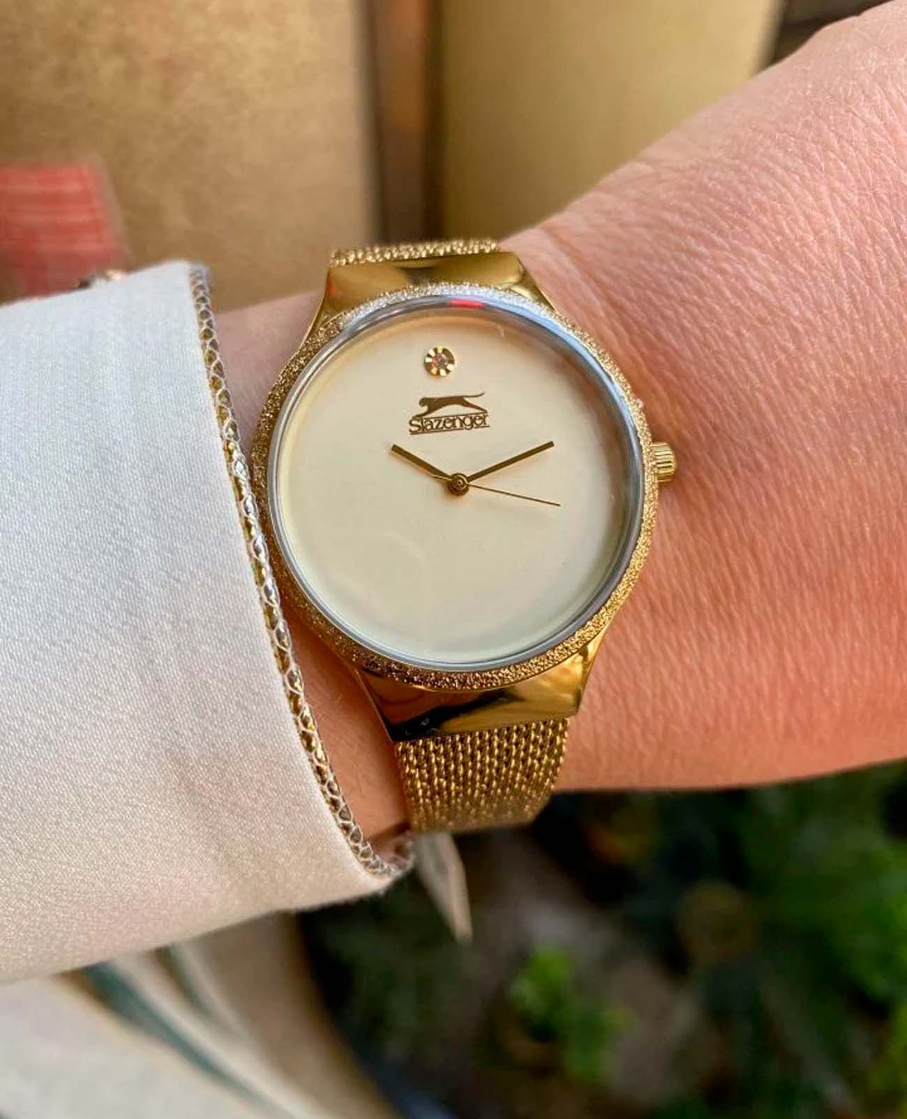 Женские наручные часы Slazenger SL.09.2015.3.03 сочетают в себе элегантный дизайн и надежность современных технологий. Модель обладает круглым корпусом диаметром 35 мм, изготовленным из суперметалла с IP-покрытиемIP-покрытиеМетод ионного напыления. Демонстрирует повышенную устойчивость к истиранию, окислению и химическим веществам. Под воздействием высокого давления и температуры около 1500°C молекулы металла надёжно соединяются с частицами корпуса часов., что обеспечивает высокую устойчивость к внешним воздействиям. Браслет выполнен в виде миланского плетения из того же материала с раскладным замкомРаскладной замокДанный вариант застежки используется только на часах с металлическим браслетом. Отличительная особенность такого крепления в том, что длина браслета становится универсальной и вы можете самостоятельно отрегулировать нужный вам размер – застежка просто двигается по браслету часов., гарантируя комфортное ношение и стильный внешний вид. Циферблат украшен индексами и кристаллами, а также оснащен тремя стрелками для показания часов, минут и секунд. Для защиты применяется минеральное стеклоМинеральное стеклоМинеральное стекло представляет собой искусственно выращенный минерал кварца. Такое стекло отличается особой устойчивостью к повреждениям и царапинам. Уступает по некоторым качествам сапфировому стеклу., обеспечивающее прочную защиту от царапин. Часы работают на японском кварцевом механизме, что гарантирует точное время без необходимости подзаводки. Водонепроницаемость часов достигает 5 атмосфер (50 метров), что позволяет использовать их при контакте с водой, например, во время мытья рук или попадания брызг, однако не рекомендуется для плавания.