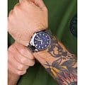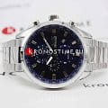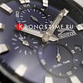 Циферблат тёмно-синего цвета декорирован стрелками с люминесцентным покрытиемЛюминесцентное покрытиеПозволяет считывать показания времени в темноте. Производители наносят на стрелки, часовые индексы, безель или поверхность циферблата светонакопительный состав, дающий холодное свечение., которые обеспечивают читаемость времени даже в условиях недостаточной освещенности. Для защиты используется минеральное стеклоМинеральное стеклоМинеральное стекло представляет собой искусственно выращенный минерал кварца. Такое стекло отличается особой устойчивостью к повреждениям и царапинам. Уступает по некоторым качествам сапфировому стеклу., обеспечивающее прочную защиту от царапин.