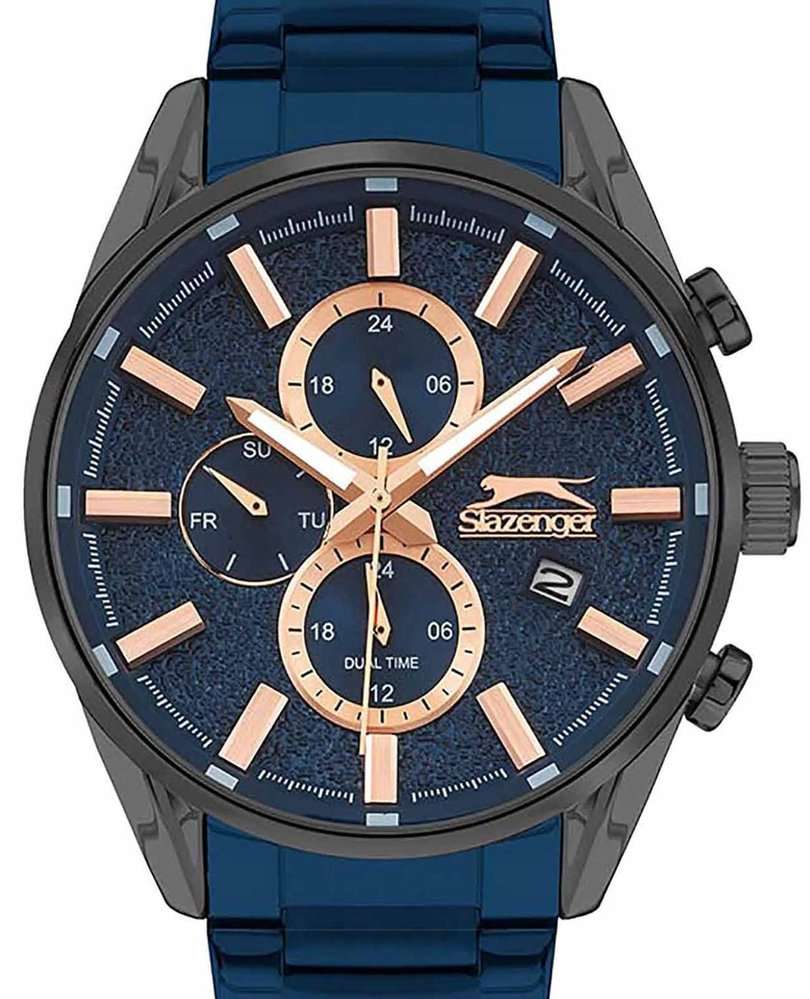 Часы Slazenger SL.09.2059.2.04 представляют собой стильное и функциональное дополнение к вашему образу. Их синий циферблат и корпус с безелемБезельВнешний ободок, закрепляющий стекло. В спортивных часах так называется поворотное кольцо с делениями на циферблате, выполняет роль таймера – замеряет отрезки времени на шкале. Неподвижный безель – элемент декора. Однонаправленно вращающийся безель на дайверских часах позволяет фиксировать моменты погружения и выныривания на поверхность. из суперметалла с IP-покрытиемIP-покрытиеМетод ионного напыления. Демонстрирует повышенную устойчивость к истиранию, окислению и химическим веществам. Под воздействием высокого давления и температуры около 1500°C молекулы металла надёжно соединяются с частицами корпуса часов. создают элегантный и современный вид, который подчеркнет вашу индивидуальность. Эти мужские часы оснащены кварцевым механизмом, обеспечивающим точность хода. Минеральное стеклоМинеральное стеклоМинеральное стекло представляет собой искусственно выращенный минерал кварца. Такое стекло отличается особой устойчивостью к повреждениям и царапинам. Уступает по некоторым качествам сапфировому стеклу. защищает циферблат от царапин, а люминесцентное покрытиеЛюминесцентное покрытиеПозволяет считывать показания времени в темноте. Производители наносят на стрелки, часовые индексы, безель или поверхность циферблата светонакопительный состав, дающий холодное свечение. на стрелках позволяет легко считывать время даже в темноте. Функциональность часов дополнена вторым часовым поясомВторой часовой поясФункция, позволяющая отображать время двух часовых поясов одновременно., 24-часовым указателем времени, календарем даты в районе 4 часа и дня недели. Синий браслет из суперметалла с IP-покрытиемIP-покрытиеМетод ионного напыления. Демонстрирует повышенную устойчивость к истиранию, окислению и химическим веществам. Под воздействием высокого давления и температуры около 1500°C молекулы металла надёжно соединяются с частицами корпуса часов. и с раскладной застёжкойРаскладная застёжкаТакой тип застёжки используется только на браслетах из металла. Она никогда не раскрывается полностью, происходит разделение на 2 и более частей. Раскладывающая застёжка снизит вероятность потери часов к минимуму. гармонично дополняет общий дизайн. Размер корпуса составляет 44 мм в диаметре и 12 мм в толщину, что делает их удобными для повседневного ношения. А водозащита уровня 5 ATM делает их надежными спутниками даже в условиях повышенной влажности.