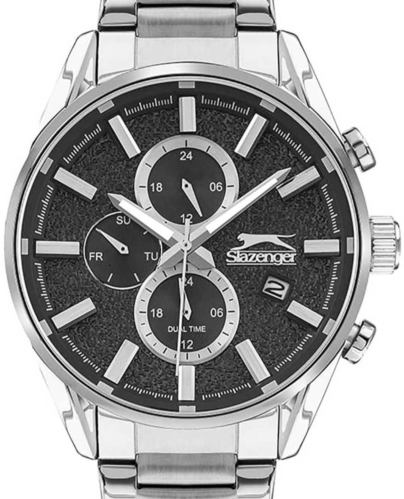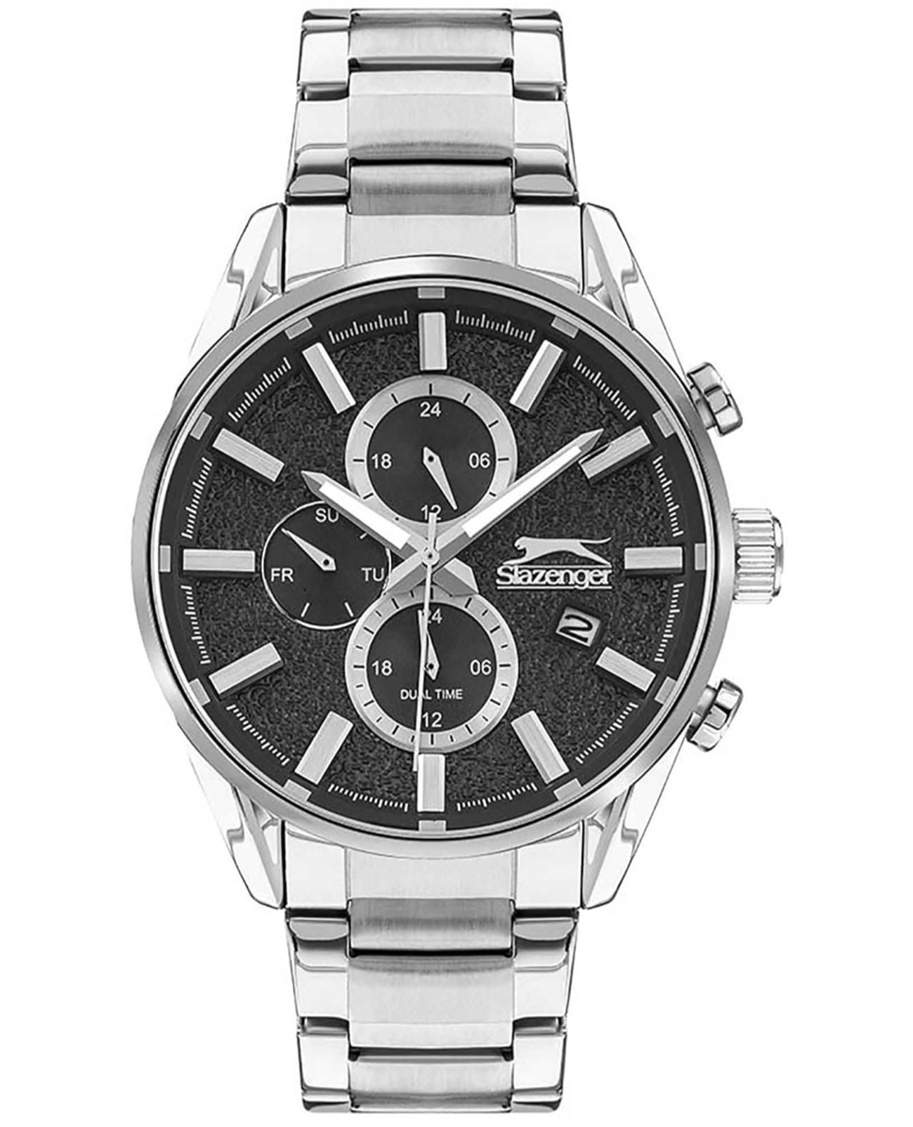 Мужские кварцевые часы Slazenger — это стильный и функциональный аксессуар с корпусом из суперметалла и черным циферблатом. Часы оснащены множеством полезных функций: отображением второго часового пояса, 24-часовым указателем времени, индикацией дня недели и окошком даты, расположенным в положении 3 часа. Стрелки и метки покрыты люминесцентным покрытиемЛюминесцентное покрытиеПозволяет считывать показания времени в темноте. Производители наносят на стрелки, часовые индексы, безель или поверхность циферблата светонакопительный состав, дающий холодное свечение., обеспечивая хорошую читаемость в темноте. Защиту обеспечивает минеральное стеклоМинеральное стеклоМинеральное стекло представляет собой искусственно выращенный минерал кварца. Такое стекло отличается особой устойчивостью к повреждениям и царапинам. Уступает по некоторым качествам сапфировому стеклу.. Браслет из суперметалла фиксируется на раскладной застёжкеРаскладная застёжкаТакой тип застёжки используется только на браслетах из металла. Она никогда не раскрывается полностью, происходит разделение на 2 и более частей. Раскладывающая застёжка снизит вероятность потери часов к минимуму., обеспечивая надёжность и комфорт ношения. Водонепроницаемость 50 м позволяет использовать часы в повседневных условиях, защищая от случайных брызг и капель дождя. Модель сочетает в себе современный дизайн, насыщенную функциональность и надёжность, подчёркивая индивидуальность владельца.