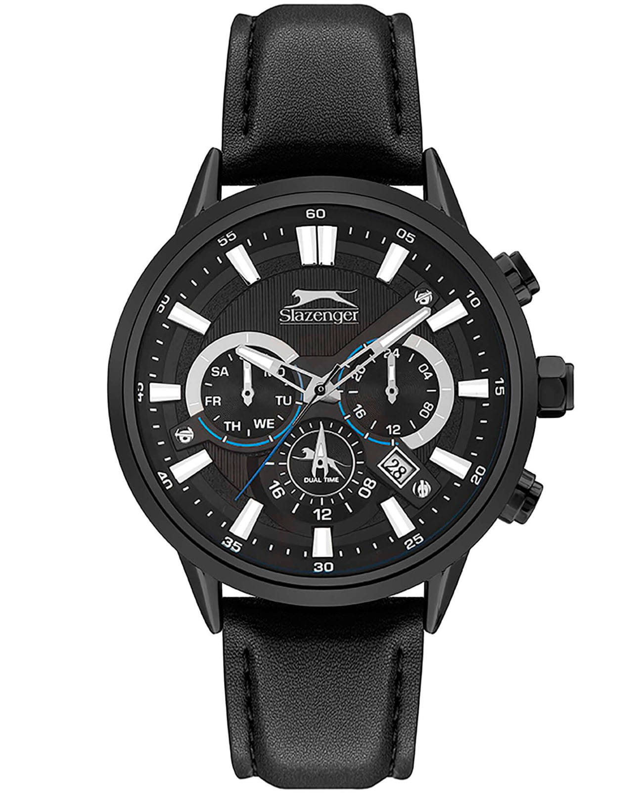 Мужские наручные часы Slazenger SL.09.2062.2.03 сочетают в себе классический дизайн и функциональность для повседневного использования. Модель обладает круглым корпусом диаметром 45 мм, изготовленным из суперметалла с IP-покрытиемIP-покрытиеМетод ионного напыления. Демонстрирует повышенную устойчивость к истиранию, окислению и химическим веществам. Под воздействием высокого давления и температуры около 1500°C молекулы металла надёжно соединяются с частицами корпуса часов., что обеспечивает высокую устойчивость к внешним воздействиям. Браслет выполнен из кожи на стандартной застежке, что гарантирует комфортное ношение. Черный циферблат украшен логотипом бренда и метками в виде штрихов; окошко даты находится между отметками 4 и 5 часов. Для защиты используется минеральное стеклоМинеральное стеклоМинеральное стекло представляет собой искусственно выращенный минерал кварца. Такое стекло отличается особой устойчивостью к повреждениям и царапинам. Уступает по некоторым качествам сапфировому стеклу., обеспечивающее прочную защиту от царапин. Часы работают на кварцевом механизме, что гарантирует точное время без необходимости подзаводки. Модель оснащена дополнительными функциями: индикатор второго часового поясаВторой часовой поясФункция, позволяющая отображать время двух часовых поясов одновременно., дня недели и текущего времени в 24-часовом формате, делая ее идеальной для путешествий и деловых встреч. Водонепроницаемость часов достигает 5 атмосфер (50 метров), что позволяет использовать их при легком контакте с водой, например, во время мытья рук, однако не рекомендуется для плавания или дайвинга. Стрелки и метки имеют люминесцентное покрытиеЛюминесцентное покрытиеПозволяет считывать показания времени в темноте. Производители наносят на стрелки, часовые индексы, безель или поверхность циферблата светонакопительный состав, дающий холодное свечение., обеспечивающее видимость в темноте.