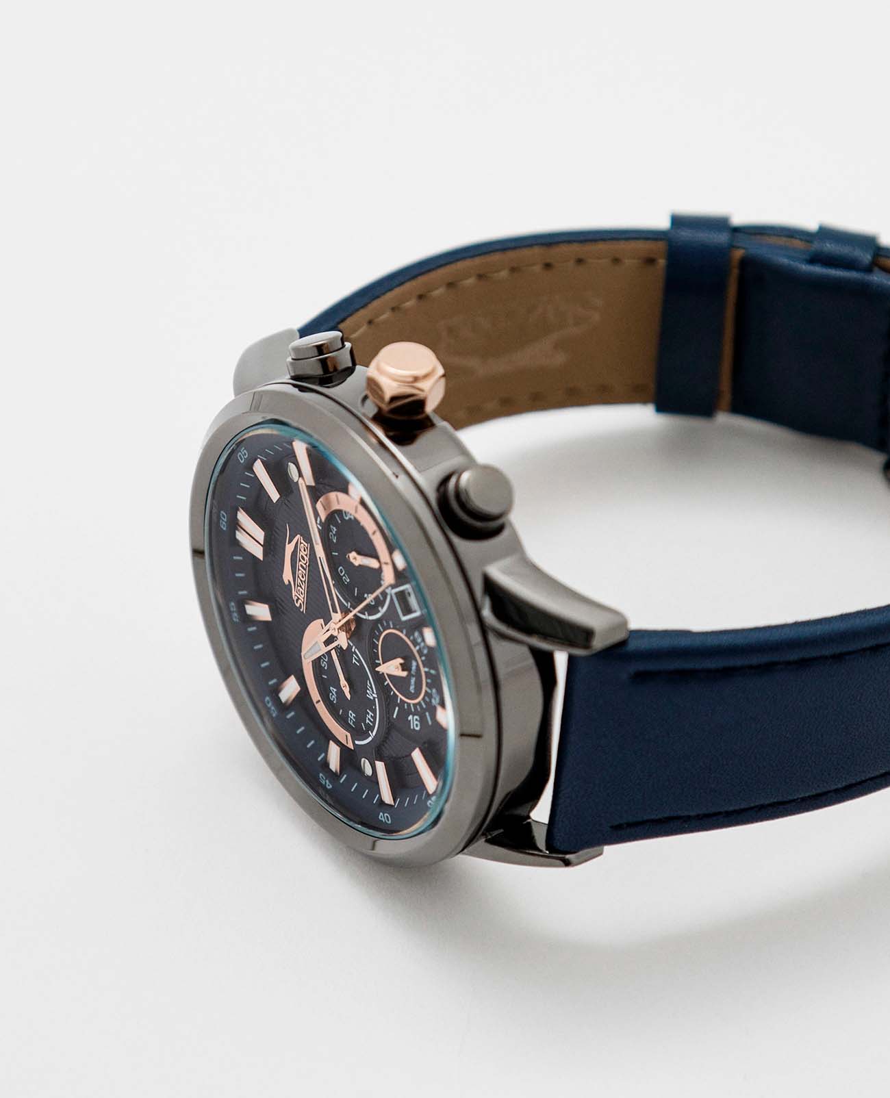Мужские наручные часы Slazenger SL.09.2062.2.04 сочетают в себе классический дизайн и надежность современных технологий. Модель обладает круглым корпусом диаметром 45 мм, изготовленным из суперметалла с IP-покрытиемIP-покрытиеМетод ионного напыления. Демонстрирует повышенную устойчивость к истиранию, окислению и химическим веществам. Под воздействием высокого давления и температуры около 1500°C молекулы металла надёжно соединяются с частицами корпуса часов., что обеспечивает высокую устойчивость к внешним воздействиям. Браслет выполнен из кожи navy blue цвета с раскладной застежкой, гарантирующей комфортное ношение и безопасность. Циферблат серого цвета декорирован стрелками с люминесцентным покрытиемЛюминесцентное покрытиеПозволяет считывать показания времени в темноте. Производители наносят на стрелки, часовые индексы, безель или поверхность циферблата светонакопительный состав, дающий холодное свечение., которые обеспечивают читаемость времени даже в условиях недостаточной освещенности. Для защиты используется минеральное стеклоМинеральное стеклоМинеральное стекло представляет собой искусственно выращенный минерал кварца. Такое стекло отличается особой устойчивостью к повреждениям и царапинам. Уступает по некоторым качествам сапфировому стеклу., обеспечивающее прочную защиту от царапин. Часы работают на японском кварцевом механизме, что гарантирует точное время без необходимости подзаводки. Модель также оснащена функциями отображения второго часового пояса, дня недели и текущего времени в 24-часовом формате на малых циферблатах, делая её практичной для повседневного использования и путешествий. Водонепроницаемость часов достигает 5 атмосфер (WR50), что позволяет использовать их во время плавания, однако не рекомендуется для дайвинга или других водных видов спорта. Толщина корпуса составляет 12 мм . SL.09.2062.2.04 — это стильный аксессуар, который станет отличным дополнением как формального, так и casual образа мужчины.