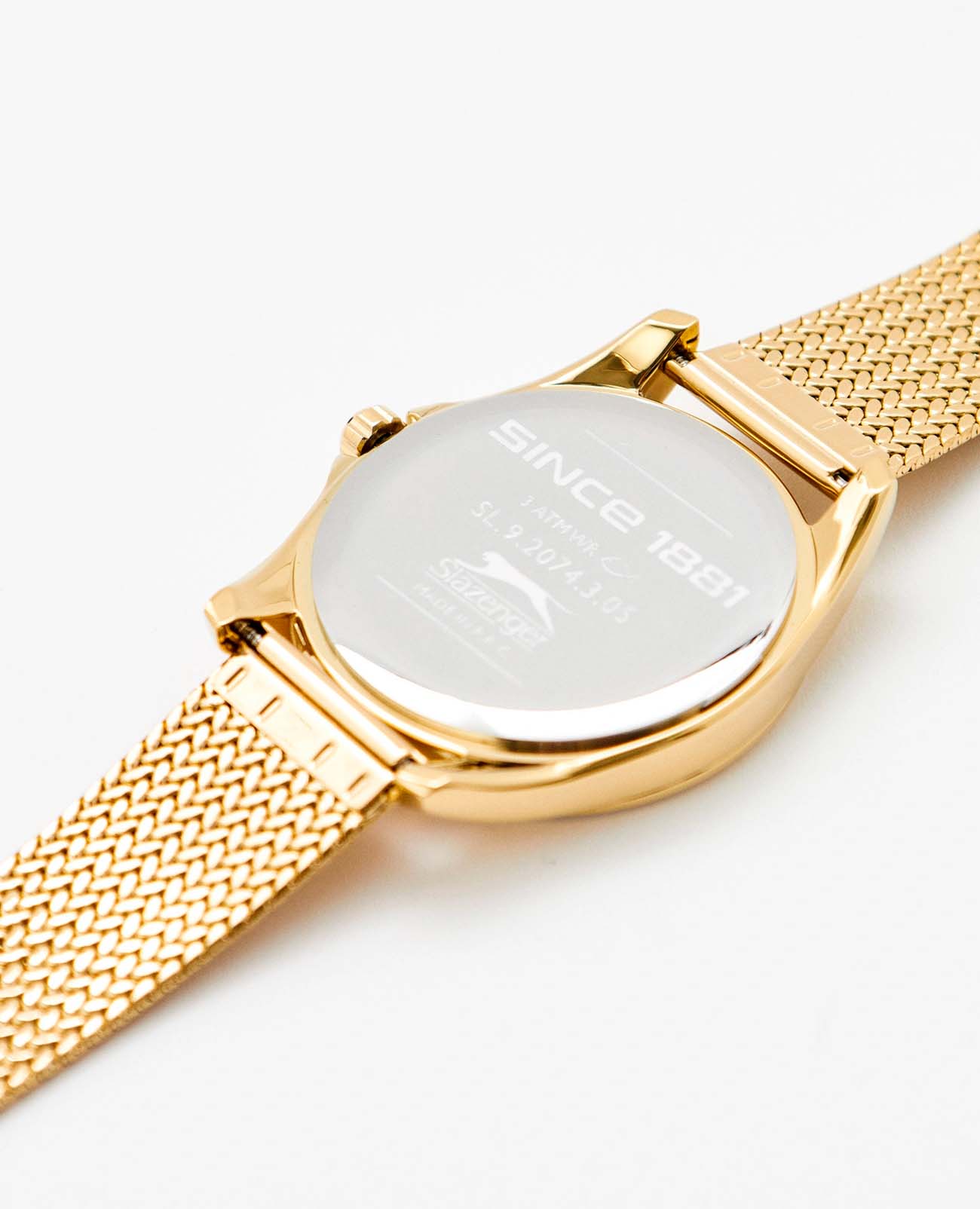 Женские наручные часы Slazenger SL.09.2074.3.05 сочетают в себе элегантный дизайн и практичность современных технологий. Модель обладает круглым корпусом диаметром 37 мм, изготовленным из суперметалла с IP-покрытиемIP-покрытиеМетод ионного напыления. Демонстрирует повышенную устойчивость к истиранию, окислению и химическим веществам. Под воздействием высокого давления и температуры около 1500°C молекулы металла надёжно соединяются с частицами корпуса часов., что обеспечивает высокую устойчивость к внешним воздействиям. Браслет выполнен из того же материала на раскладном замкеРаскладной замокДанный вариант застежки используется только на часах с металлическим браслетом. Отличительная особенность такого крепления в том, что длина браслета становится универсальной и вы можете самостоятельно отрегулировать нужный вам размер – застежка просто двигается по браслету часов., гарантирующей комфортное ношение и безопасность. Для защиты используется минеральное стеклоМинеральное стеклоМинеральное стекло представляет собой искусственно выращенный минерал кварца. Такое стекло отличается особой устойчивостью к повреждениям и царапинам. Уступает по некоторым качествам сапфировому стеклу., обеспечивающее прочную защиту от царапин. Часы работают на кварцевом механизме, что гарантирует точное время без необходимости подзаводки. Водонепроницаемость достигает 3 атмосфер (WR30), что позволяет использовать их при контакте с брызгами воды, однако не рекомендуется для плавания или дайвинга.