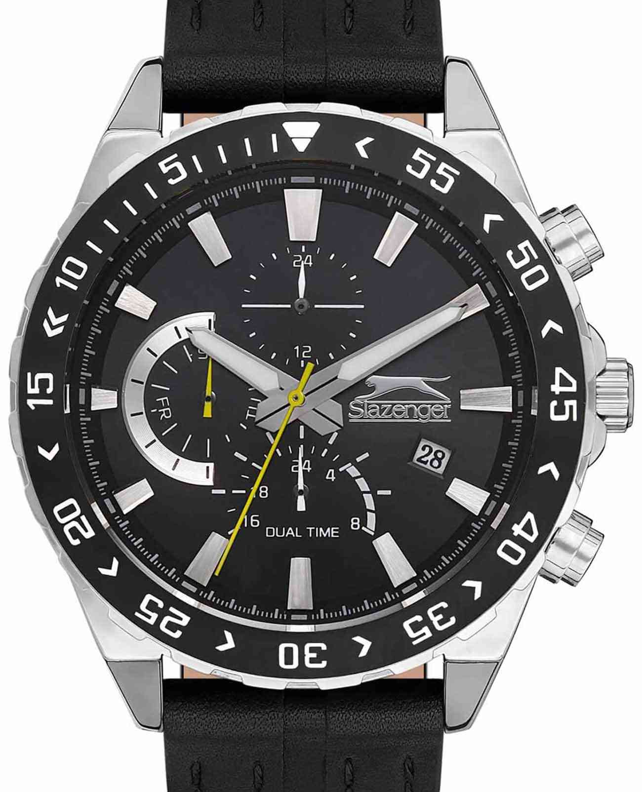 Slazenger SL.09.2152.2.01 – это великолепное сочетание стиля и функциональности, созданное для тех, кто ценит элегантность и надежность. Эти наручные часы работают на кварцевом механизме, обеспечивая точность и долговечность. Корпус выполнен из прочного суперметалла, а безельБезельВнешний ободок, закрепляющий стекло. В спортивных часах так называется поворотное кольцо с делениями на циферблате, выполняет роль таймера – замеряет отрезки времени на шкале. Неподвижный безель – элемент декора. Однонаправленно вращающийся безель на дайверских часах позволяет фиксировать моменты погружения и выныривания на поверхность. из суперметалла с черным IP-покрытиемIP-покрытиеМетод ионного напыления. Демонстрирует повышенную устойчивость к истиранию, окислению и химическим веществам. Под воздействием высокого давления и температуры около 1500°C молекулы металла надёжно соединяются с частицами корпуса часов., что придает часам современный и утонченный вид. Черный циферблат, оформленный в технике Sunray, украшен логотипом бренда и часовыми метками в виде штрихов, что добавляет аксессуару изысканности. Особенностью данной модели является наличие календаря, отображающего дату и день недели, а также возможность следить за временем во втором часовом поясе. Все это удобно размещено на отдельных циферблатах, что делает использование часов максимально комфортным. Рифленая заводная головка снабжена защитой, что обеспечивает дополнительную надежность. Часы также обладают водозащитой на уровне 50WR, что позволяет им выдерживать воздействие воды в повседневных ситуациях. Минеральное стеклоМинеральное стеклоМинеральное стекло представляет собой искусственно выращенный минерал кварца. Такое стекло отличается особой устойчивостью к повреждениям и царапинам. Уступает по некоторым качествам сапфировому стеклу. защищает циферблат от царапин и повреждений, сохраняя его внешний вид безупречным. Люминесцентное покрытиеЛюминесцентное покрытиеПозволяет считывать показания времени в темноте. Производители наносят на стрелки, часовые индексы, безель или поверхность циферблата светонакопительный состав, дающий холодное свечение. на стрелках обеспечивает отличную видимость в темноте. Завершающим штрихом образа является кожаный ремешок с классической застежкой, который обеспечивает удобную посадку на запястье и добавляет модели роскошный акцент.