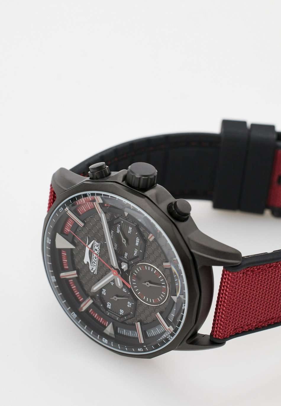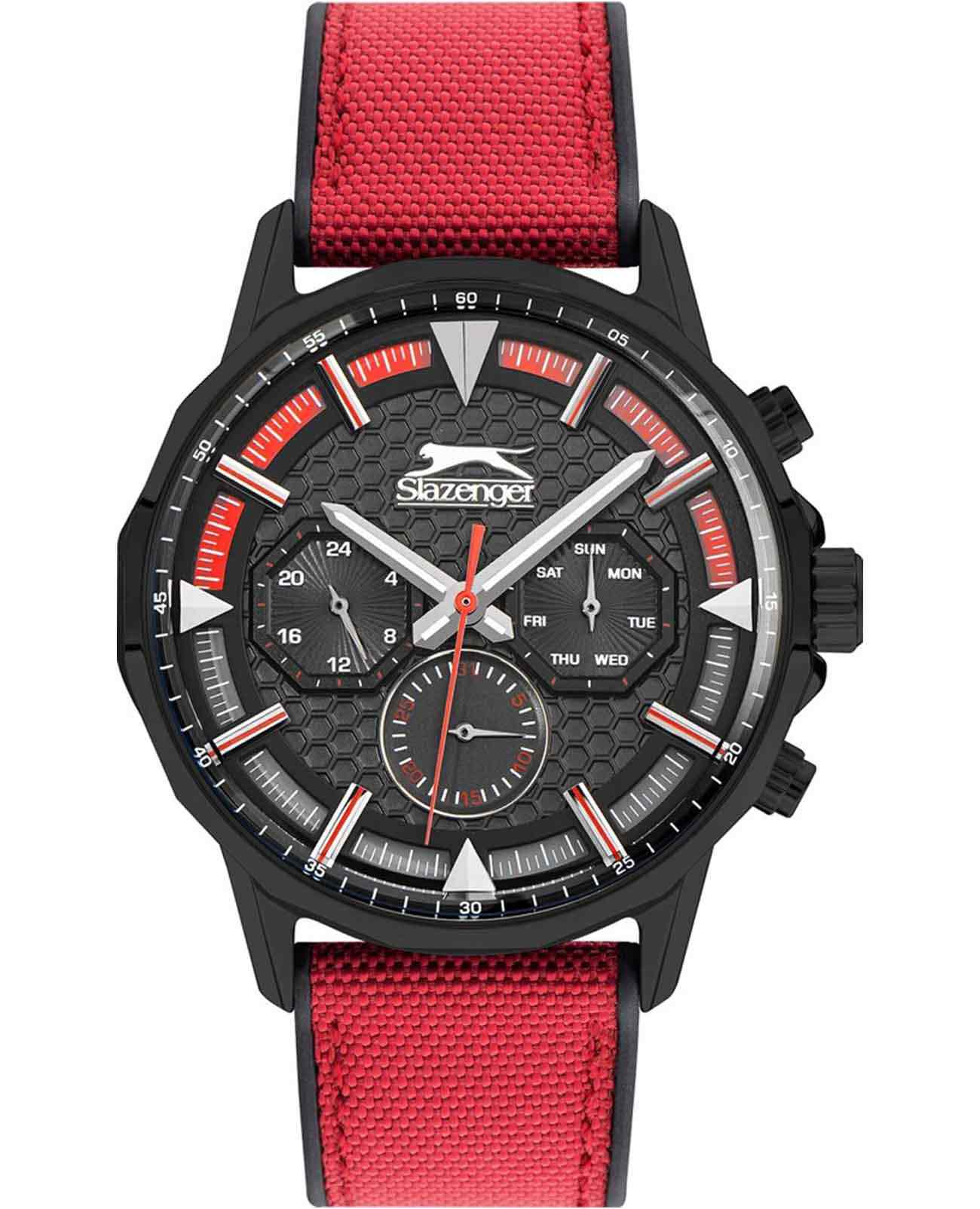 Стильные мужские наручные часы Slazenger SL.09.2217.2.05 станут идеальным аксессуаром для современного мужчины. Этот британский бренд славится своим качеством и надежностью, а данная модель не является исключением. Часы оснащены кварцевым механизмом, что обеспечивает точность хода и долговечность использования. Корпус часов выполнен из металла с черным IP-покрытиемIP-покрытиеМетод ионного напыления. Демонстрирует повышенную устойчивость к истиранию, окислению и химическим веществам. Под воздействием высокого давления и температуры около 1500°C молекулы металла надёжно соединяются с частицами корпуса часов., а прочное  минеральное стеклоМинеральное стеклоМинеральное стекло представляет собой искусственно выращенный минерал кварца. Такое стекло отличается особой устойчивостью к повреждениям и царапинам. Уступает по некоторым качествам сапфировому стеклу. защищает циферблат от царапин и повреждений. Элегантный красный тканевый ремешок на черном силиконовом основании с классической застежкой, что гарантирует комфортное ношение на запястье. Ширина браслета составляет 22 мм, что придает часам солидный вид. Диаметр корпуса равен 45 мм, а толщина 12 мм, что делает эту модель заметной, но в то же время не громоздкой. Водозащита уровня WR 50 позволяет использовать часы в повседневной жизни, не беспокоясь о случайных попаданиях воды. Стрелки снабжены люминесцентным покрытиемЛюминесцентное покрытиеПозволяет считывать показания времени в темноте. Производители наносят на стрелки, часовые индексы, безель или поверхность циферблата светонакопительный состав, дающий холодное свечение., что позволяет легко считывать время в темноте. Функциональные возможности часов включают отображение даты, дня недели и времени в 24-часовом формате на дополнительных малых циферблатах. Это делает модель не только стильной, но и практичной в использовании.
