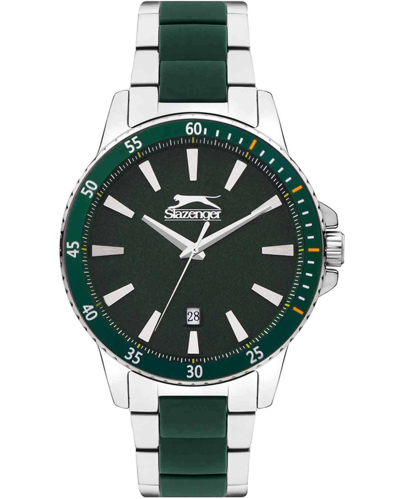 Часы Slazenger SL.09.2219.1.04 представляют собой стильное и функциональное аксессуарное решение для современных мужчин. Этот английский бренд предлагает кварцевый механизм, обеспечивающий точность хода и надежность в использовании. Корпус из металла и минеральное стеклоМинеральное стеклоМинеральное стекло представляет собой искусственно выращенный минерал кварца. Такое стекло отличается особой устойчивостью к повреждениям и царапинам. Уступает по некоторым качествам сапфировому стеклу. придают часам прочность и износостойкость, а водозащита уровня WR 30 позволяет не беспокоиться о случайных брызгах и дождевых каплях. БезельБезельВнешний ободок, закрепляющий стекло. В спортивных часах так называется поворотное кольцо с делениями на циферблате, выполняет роль таймера – замеряет отрезки времени на шкале. Неподвижный безель – элемент декора. Однонаправленно вращающийся безель на дайверских часах позволяет фиксировать моменты погружения и выныривания на поверхность. с зеленым IP-покрытиемIP-покрытиеМетод ионного напыления. Демонстрирует повышенную устойчивость к истиранию, окислению и химическим веществам. Под воздействием высокого давления и температуры около 1500°C молекулы металла надёжно соединяются с частицами корпуса часов. придаёт аксессуару современный вид и дополнительную прочность. Металлический браслет с комбинированными элементами и зелеными силиконовыми вставками обеспечивает комфортное ношение и надежную фиксацию на запястье, а раскладная застёжкаРаскладная застёжкаТакой тип застёжки используется только на браслетах из металла. Она никогда не раскрывается полностью, происходит разделение на 2 и более частей. Раскладывающая застёжка снизит вероятность потери часов к минимуму. облегчает процесс надевания.  Диаметр корпуса составляет 45 мм, а толщина — 12 мм, что делает модель выразительной и заметной на руке, при этом она сохраняет элегантность и изысканность. На зеленом циферблате присутствует окошко даты, что добавляет практичности в повседневное использование. Заводная головка оснащена защитой, обеспечивая дополнительную долговечность. Вес часов составляет 148 грамм, что делает их достаточно легкими для комфортного ношения в течение всего дня.
