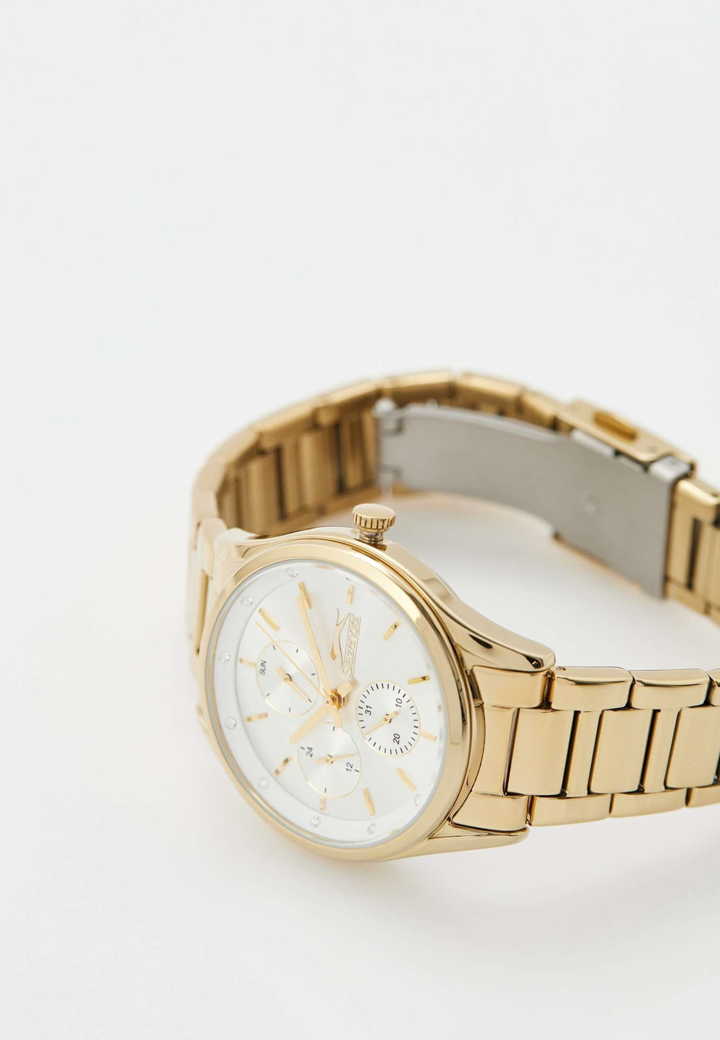 Часы Slazenger SL.09.2229.4.05 — это стильная и элегантная модель, созданная для современных женщин, ценящих изысканный дизайн и функциональность. Корпус и браслет выполнены из прочного металла золотистого цвета с IP-покрытиемIP-покрытиеМетод ионного напыления. Демонстрирует повышенную устойчивость к истиранию, окислению и химическим веществам. Под воздействием высокого давления и температуры около 1500°C молекулы металла надёжно соединяются с частицами корпуса часов., что придает аксессуару особую утонченность. Серебристый циферблат украшен мерцающими кристаллами, а также оснащён дополнительными малыми циферблатами, которые отображают дату, день недели и время в 24-часовом формате. Минеральное стеклоМинеральное стеклоМинеральное стекло представляет собой искусственно выращенный минерал кварца. Такое стекло отличается особой устойчивостью к повреждениям и царапинам. Уступает по некоторым качествам сапфировому стеклу. надежно защищает часы от царапин, а водозащита уровня WR 30 позволяет не беспокоиться о случайном попадании влаги. Металлический браслет снабжён удобной раскладной застёжкойРаскладная застёжкаТакой тип застёжки используется только на браслетах из металла. Она никогда не раскрывается полностью, происходит разделение на 2 и более частей. Раскладывающая застёжка снизит вероятность потери часов к минимуму.. Диаметр корпуса составляет 36 мм, толщина — 9 мм, а вес — 82 грамма, что обеспечивает комфортное ношение в течение всего дня. Часы оснащены кварцевым механизмом.