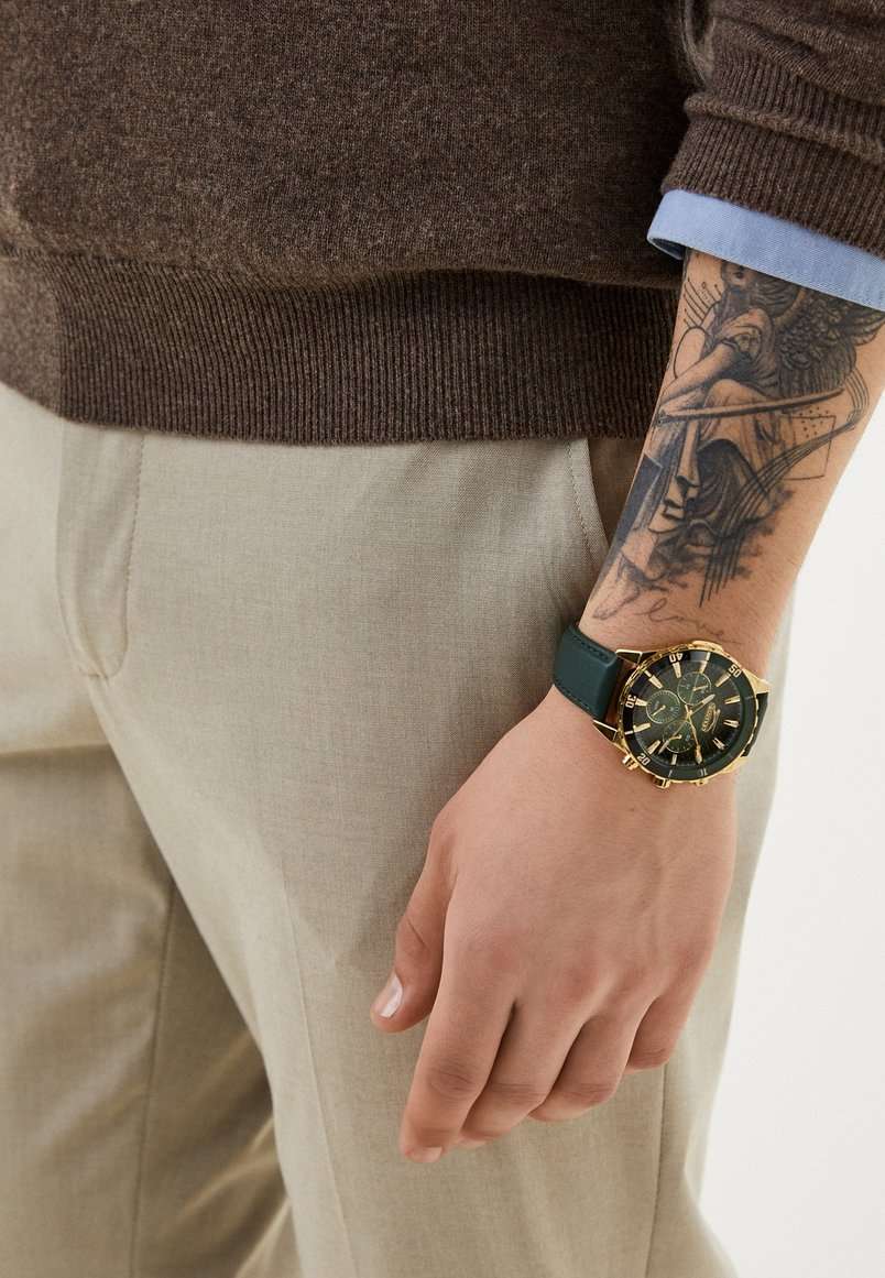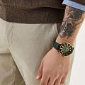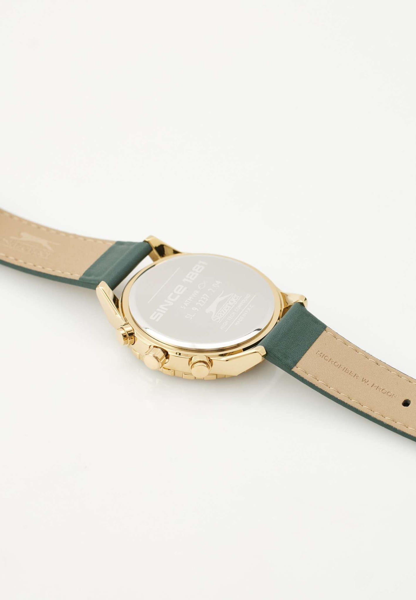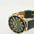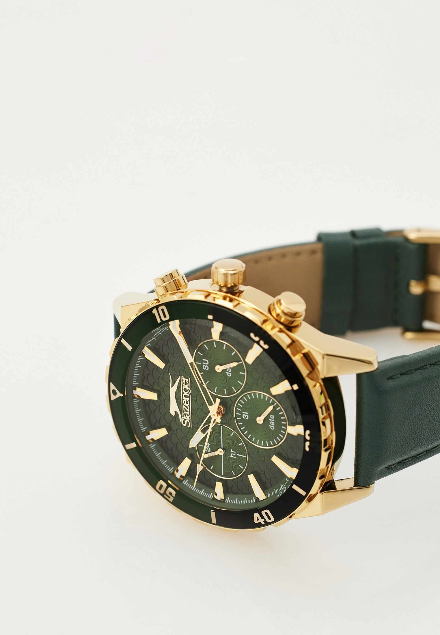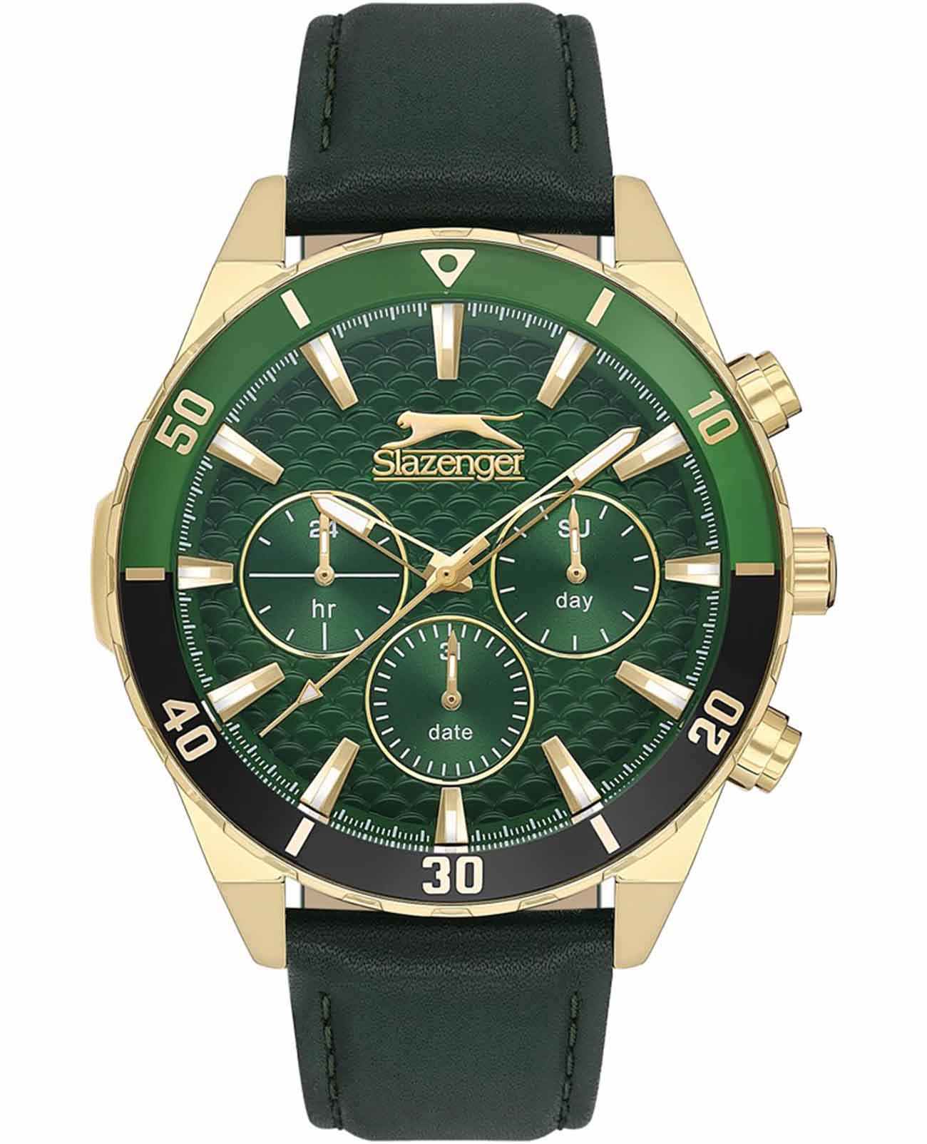 Часы Slazenger SL.09.2237.2.04 — это стильная и надежная модель, которая станет отличным выбором для активного современного мужчины. Крупный корпус диаметром 46 мм выполнен из прочного металла с золотистым IP-покрытиемIP-покрытиеМетод ионного напыления. Демонстрирует повышенную устойчивость к истиранию, окислению и химическим веществам. Под воздействием высокого давления и температуры около 1500°C молекулы металла надёжно соединяются с частицами корпуса часов., а зеленый кожаный ремешок с классической застежкой, что обеспечивает комфорт при повседневном ношении. На безельБезельВнешний ободок, закрепляющий стекло. В спортивных часах так называется поворотное кольцо с делениями на циферблате, выполняет роль таймера – замеряет отрезки времени на шкале. Неподвижный безель – элемент декора. Однонаправленно вращающийся безель на дайверских часах позволяет фиксировать моменты погружения и выныривания на поверхность. нанесено черное и зеленое IP-покрытиеIP-покрытиеМетод ионного напыления. Демонстрирует повышенную устойчивость к истиранию, окислению и химическим веществам. Под воздействием высокого давления и температуры около 1500°C молекулы металла надёжно соединяются с частицами корпуса часов.. Минеральное стеклоМинеральное стеклоМинеральное стекло представляет собой искусственно выращенный минерал кварца. Такое стекло отличается особой устойчивостью к повреждениям и царапинам. Уступает по некоторым качествам сапфировому стеклу. защищает текстурированный синий циферблат от случайных царапин, а водозащита уровня WR 50 позволяет не переживать о попадании влаги при контакте с водой. На циферблате расположены дополнительные малые циферблаты с отображением даты, дня недели и времени в 24-часовом формате, что делает использование часов максимально функциональным. Для удобства использования в темное время суток предусмотрено люминесцентное покрытиеЛюминесцентное покрытиеПозволяет считывать показания времени в темноте. Производители наносят на стрелки, часовые индексы, безель или поверхность циферблата светонакопительный состав, дающий холодное свечение. стрелок. Толщина корпуса составляет 12 мм, вес часов — 76 грамма.