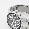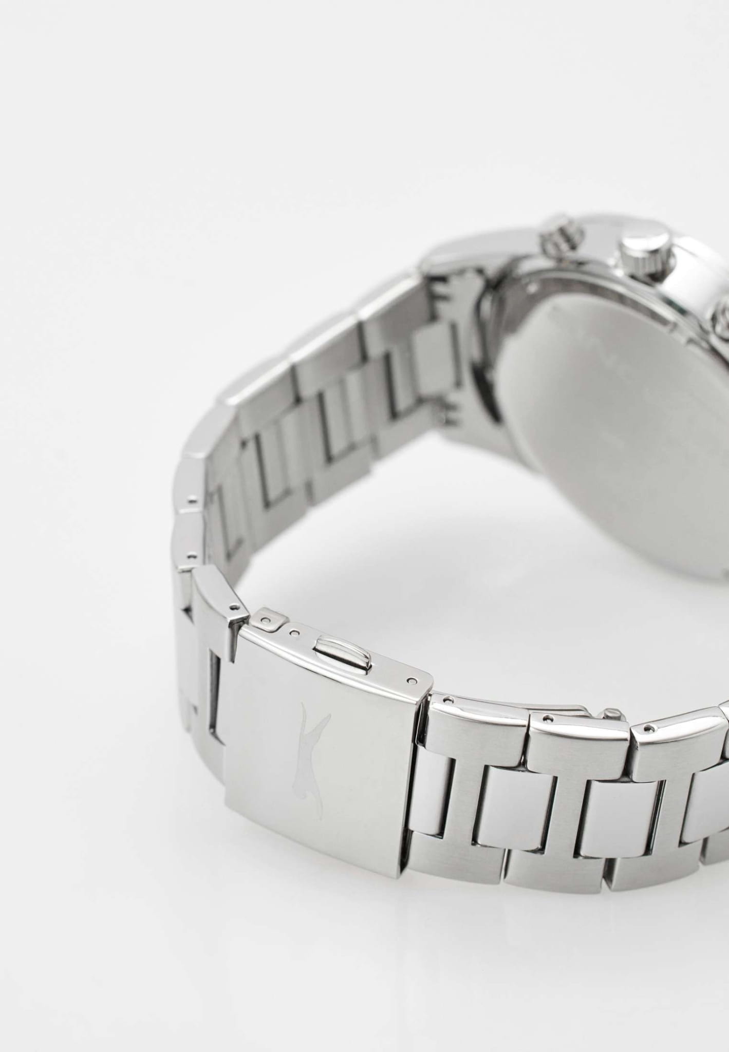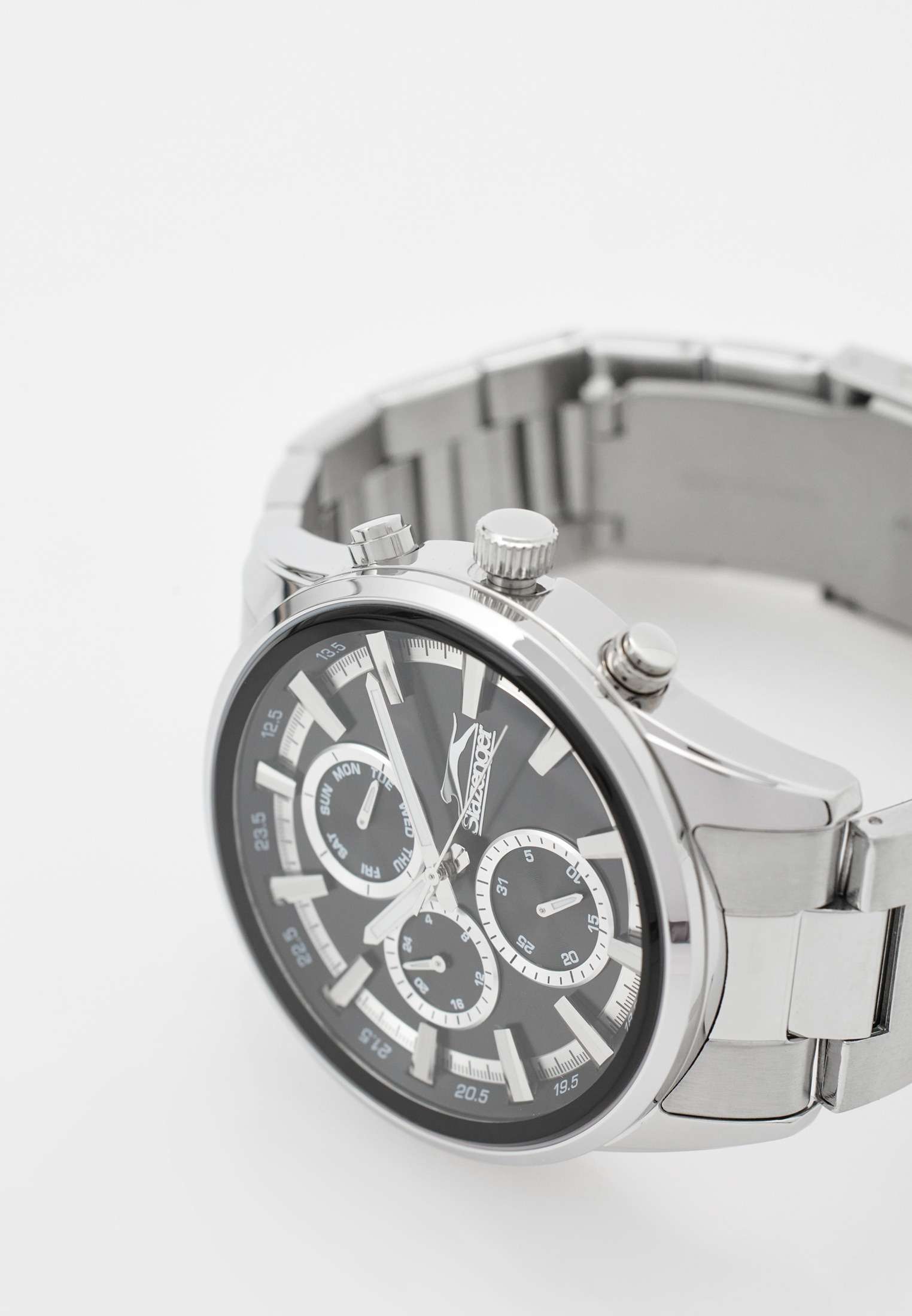 Часы Slazenger SL.09.2242.2.01 – это стильная и надежная модель, созданная для современных мужчин, ценящих качество и функциональность. Корпус и браслет выполнены из прочного металла серебряного цвета, что придает аксессуару элегантный внешний вид и обеспечивает долговечность. Часы фиксируются на руке с помощью браслета с удобной раскладной застёжкойРаскладная застёжкаТакой тип застёжки используется только на браслетах из металла. Она никогда не раскрывается полностью, происходит разделение на 2 и более частей. Раскладывающая застёжка снизит вероятность потери часов к минимуму.. Кварцевый механизм гарантирует точность хода, а минеральное стеклоМинеральное стеклоМинеральное стекло представляет собой искусственно выращенный минерал кварца. Такое стекло отличается особой устойчивостью к повреждениям и царапинам. Уступает по некоторым качествам сапфировому стеклу. защищает черный циферблат от царапин и повреждений. Диаметр корпуса составляет 46 мм, толщина – 13 мм, ширина ремешка – 24 мм, а вес часов – 146 грамм, что делает их удобными для повседневного ношения. Водозащита уровня WR 50 позволяет не снимать часы во время мытья рук и при незначительном контакте с водой. Для удобства использования в темное время суток предусмотрено люминесцентное покрытиеЛюминесцентное покрытиеПозволяет считывать показания времени в темноте. Производители наносят на стрелки, часовые индексы, безель или поверхность циферблата светонакопительный состав, дающий холодное свечение. стрелок. Модель оснащена дополнительными циферблатами, отображающими дату, день недели и текущее время в 24-часовом формате.