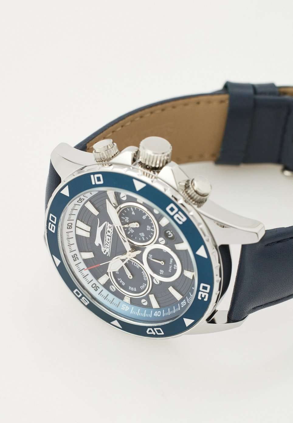 Часы Slazenger SL.09.2251.2.03 — это стильная и практичная модель, выполненная в элегантном серебристом цвете. Корпус изготовлен из металла, что обеспечивает прочность и долговечность. На безельБезельВнешний ободок, закрепляющий стекло. В спортивных часах так называется поворотное кольцо с делениями на циферблате, выполняет роль таймера – замеряет отрезки времени на шкале. Неподвижный безель – элемент декора. Однонаправленно вращающийся безель на дайверских часах позволяет фиксировать моменты погружения и выныривания на поверхность. нанесено синее IP-покрытиеIP-покрытиеМетод ионного напыления. Демонстрирует повышенную устойчивость к истиранию, окислению и химическим веществам. Под воздействием высокого давления и температуры около 1500°C молекулы металла надёжно соединяются с частицами корпуса часов.. Минеральное стеклоМинеральное стеклоМинеральное стекло представляет собой искусственно выращенный минерал кварца. Такое стекло отличается особой устойчивостью к повреждениям и царапинам. Уступает по некоторым качествам сапфировому стеклу. надежно защищает синий циферблат от царапин и повреждений. Классический кожаный ремешок синего цвета шириной 22 мм удобно фиксируется на запястье с помощью классической застежки. Диаметр корпуса составляет 44 мм, а толщина — 12 мм, благодаря чему часы смотрятся солидно и современно. Модель оснащена кварцевым механизмом, отличающимся точностью и надежностью. На циферблате представлены дополнительные малые циферблаты для отображения второго часового поясаВторой часовой поясФункция, позволяющая отображать время двух часовых поясов одновременно., дня недели и времени в 24-часовом формате, а также имеется отдельное окошко даты. Для удобства использования в темное время суток предусмотрено люминесцентное покрытиеЛюминесцентное покрытиеПозволяет считывать показания времени в темноте. Производители наносят на стрелки, часовые индексы, безель или поверхность циферблата светонакопительный состав, дающий холодное свечение. стрелок и меток. Заводная головка оснащена защитой. Водозащита уровня WR 50 позволяет не снимать часы при мытье рук или попадании под дождь. Вес модели составляет 70 грамм.