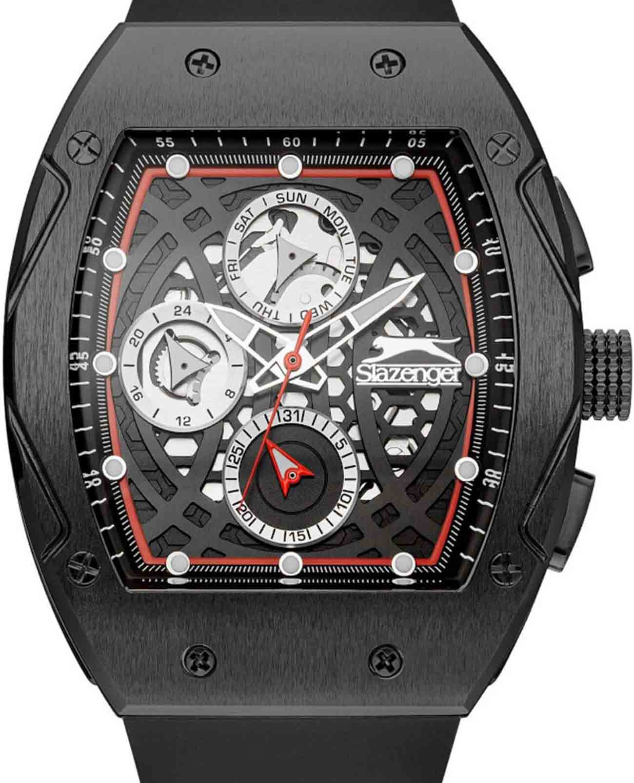 Часы Slazenger SL.09.2257.2.01 — это современная модель, сочетающая стильный внешний вид и функциональность. Крупный корпус размером 44х53 мм выполнен из металла с прочным черным IP-покрытиемIP-покрытиеМетод ионного напыления. Демонстрирует повышенную устойчивость к истиранию, окислению и химическим веществам. Под воздействием высокого давления и температуры около 1500°C молекулы металла надёжно соединяются с частицами корпуса часов., что придает часам выразительный характер и надежную защиту от внешних воздействий. Сатинированный безельБезельВнешний ободок, закрепляющий стекло. В спортивных часах так называется поворотное кольцо с делениями на циферблате, выполняет роль таймера – замеряет отрезки времени на шкале. Неподвижный безель – элемент декора. Однонаправленно вращающийся безель на дайверских часах позволяет фиксировать моменты погружения и выныривания на поверхность. гармонично сочетается с черным циферблатом, украшенным логотипом бренда и аккуратными часовыми метками в виде точек. Минеральное стеклоМинеральное стеклоМинеральное стекло представляет собой искусственно выращенный минерал кварца. Такое стекло отличается особой устойчивостью к повреждениям и царапинам. Уступает по некоторым качествам сапфировому стеклу. обеспечивает защиту от случайных царапин, а стрелки и метки с люминесцентным покрытиемЛюминесцентное покрытиеПозволяет считывать показания времени в темноте. Производители наносят на стрелки, часовые индексы, безель или поверхность циферблата светонакопительный состав, дающий холодное свечение. удобно подсвечиваются в темноте после зарядки на свету. На циферблате расположены отдельные индикаторы даты, дня недели, а также 12- и 24-часового формата времени. За точность хода отвечает кварцевый механизм, не требующий ежедневного завода. Модель снабжена черным силиконовым ремешком шириной 26 мм с классической застежкой, который комфортно фиксируется на запястье и подходит для активного образа жизни. Водозащита 50WR позволяет не снимать часы при мытье рук или во время прогулок под дождем.