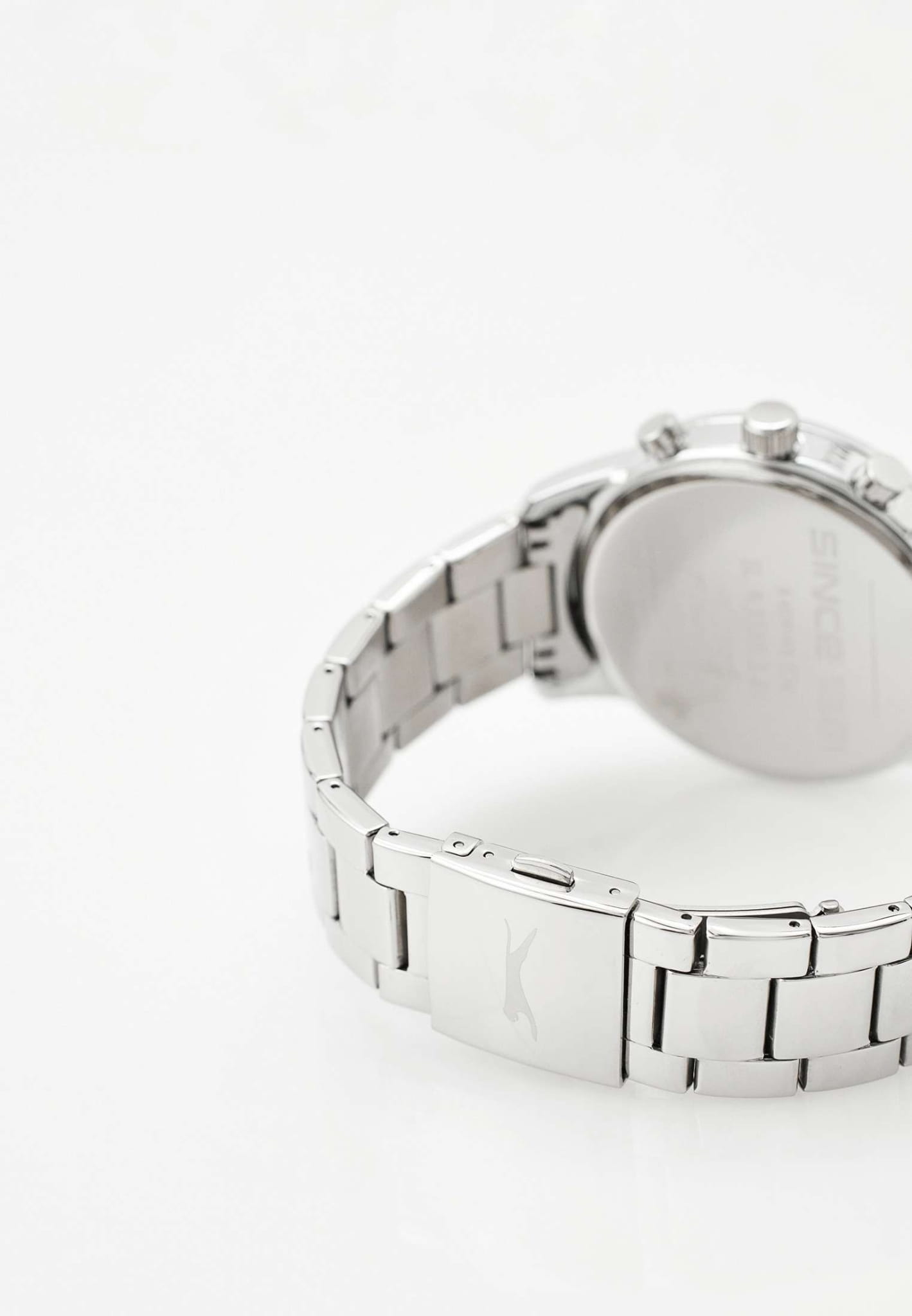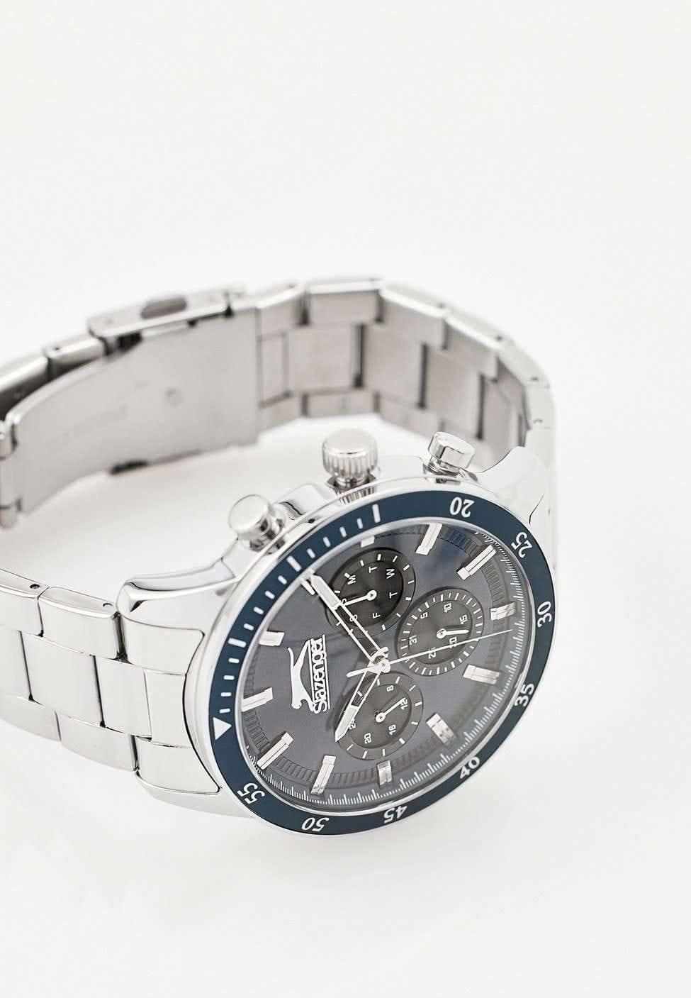 Часы Slazenger SL.09.2260.2.01 сочетают в себе выразительный дизайн и практичность, делая их отличным выбором для современного мужчины. Корпус и браслет выполнены из суперметалла — прочного сплава на основе меди с низким содержанием цинка и никеля, что обеспечивает долговечность изделия. На безельБезельВнешний ободок, закрепляющий стекло. В спортивных часах так называется поворотное кольцо с делениями на циферблате, выполняет роль таймера – замеряет отрезки времени на шкале. Неподвижный безель – элемент декора. Однонаправленно вращающийся безель на дайверских часах позволяет фиксировать моменты погружения и выныривания на поверхность. нанесено синее IP-покрытиеIP-покрытиеМетод ионного напыления. Демонстрирует повышенную устойчивость к истиранию, окислению и химическим веществам. Под воздействием высокого давления и температуры около 1500°C молекулы металла надёжно соединяются с частицами корпуса часов., что придает аксессуару утончённый и универсальный внешний вид. Модель оснащена точным кварцевым механизмом, защищённым минеральным стекломМинеральное стеклоМинеральное стекло представляет собой искусственно выращенный минерал кварца. Такое стекло отличается особой устойчивостью к повреждениям и царапинам. Уступает по некоторым качествам сапфировому стеклу.. На синем циферблате размещены дополнительные индикаторы: 24-часовой формат времени, дата и день недели. Класс водозащиты 5 бар позволяет не беспокоиться о брызгах и дожде. Диаметр корпуса составляет 45 мм, толщина — 12 мм, что придаёт часам солидный и современный вид. Стрелки с люминесцентным покрытиемЛюминесцентное покрытиеПозволяет считывать показания времени в темноте. Производители наносят на стрелки, часовые индексы, безель или поверхность циферблата светонакопительный состав, дающий холодное свечение. удобно подсвечиваются в темноте после зарядки на свету. Стальной браслет с раскладной застёжкойРаскладная застёжкаТакой тип застёжки используется только на браслетах из металла. Она никогда не раскрывается полностью, происходит разделение на 2 и более частей. Раскладывающая застёжка снизит вероятность потери часов к минимуму. обеспечивает комфортную посадку. Модель станет надёжным спутником как на каждый день, так и для особых случаев, а также превосходно подойдёт в качестве подарка.