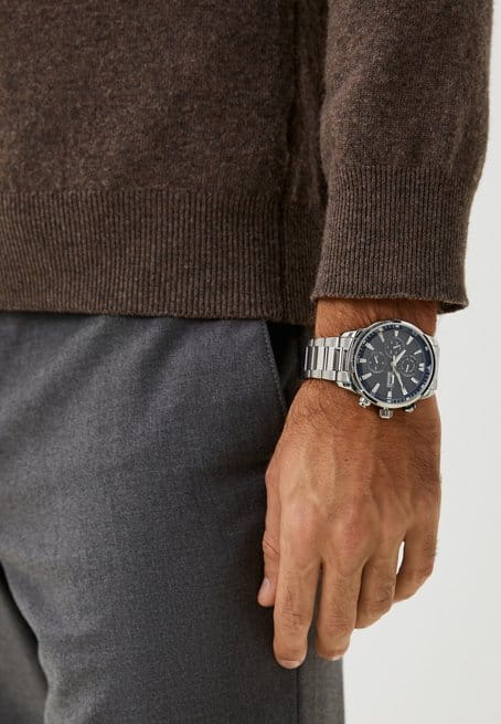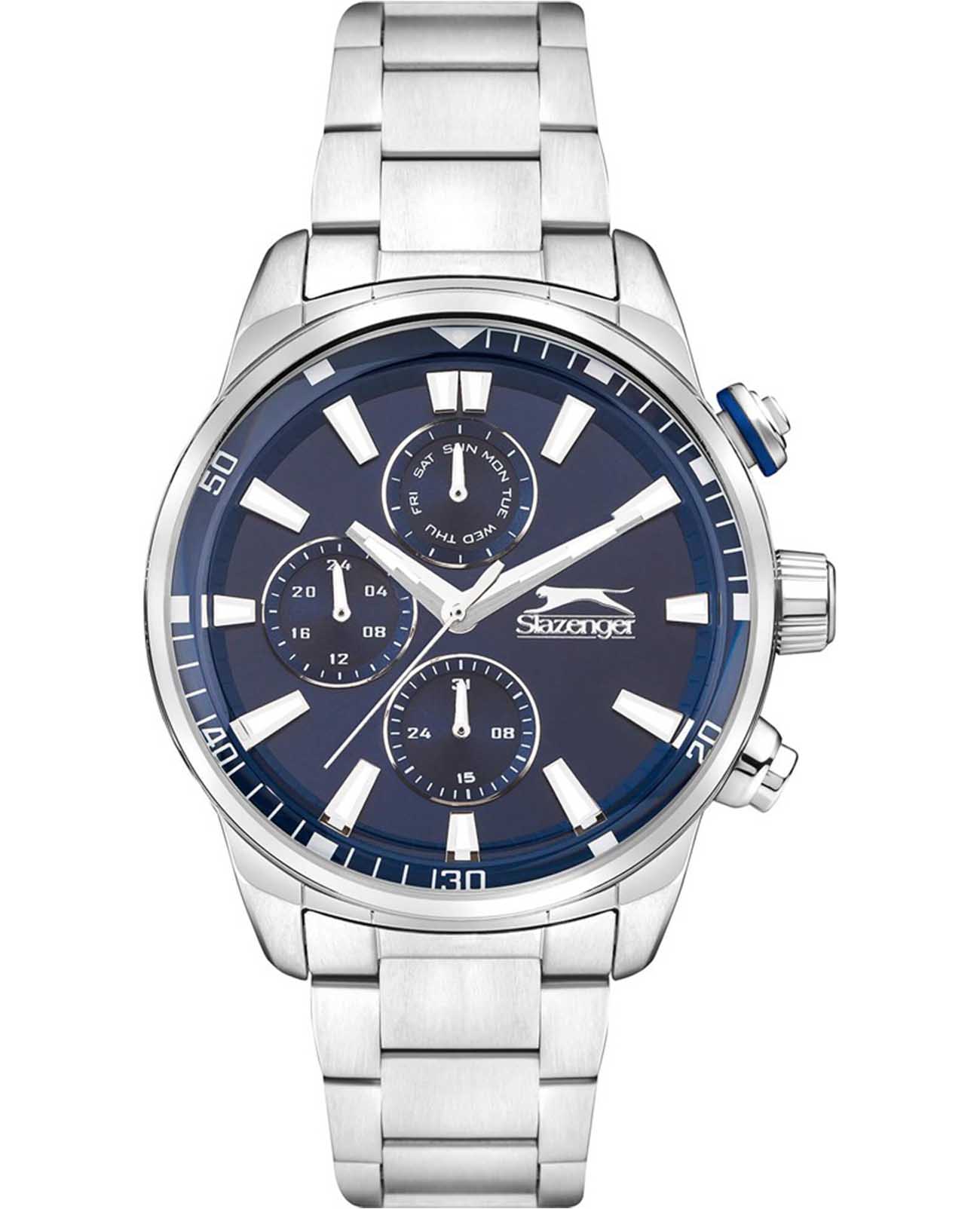 Часы Slazenger SL.09.2272.2.02 – это стильный аксессуар, сочетающий в себе современный дизайн и продуманную функциональность. Модель оснащена точным кварцевым механизмом, который гарантирует стабильную работу и легкость в использовании. Корпус и браслет выполнены из суперметалла — инновационного сплава на основе меди с пониженным содержанием цинка и никеля, обладающего высокой прочностью и устойчивостью к износу благодаря особой технологии покрытия. Элегантный синий циферблат защищён надёжным минеральным стекломМинеральное стеклоМинеральное стекло представляет собой искусственно выращенный минерал кварца. Такое стекло отличается особой устойчивостью к повреждениям и царапинам. Уступает по некоторым качествам сапфировому стеклу., устойчивым к царапинам и повреждениям. На циферблате размещены отдельные индикаторы: 24-часовой указатель времени, а также дополнительные циферблаты для отображения даты и дня недели, что делает модель максимально информативной и удобной в повседневном использовании. Водозащита 5 АТМ (5 бар) надёжно защищает механизм от брызг и дождя, а диаметр корпуса 45 мм и толщина 13 мм обеспечивают солидный внешний вид и комфортную посадку на запястье. Стальной браслет с раскладной застёжкойРаскладная застёжкаТакой тип застёжки используется только на браслетах из металла. Она никогда не раскрывается полностью, происходит разделение на 2 и более частей. Раскладывающая застёжка снизит вероятность потери часов к минимуму. обеспечивает комфортную посадку. Стрелки с люминесцентным покрытиемЛюминесцентное покрытиеПозволяет считывать показания времени в темноте. Производители наносят на стрелки, часовые индексы, безель или поверхность циферблата светонакопительный состав, дающий холодное свечение. удобно подсвечиваются в темноте после зарядки на свету. Часы подойдут как для ежедневного ношения, так и для особых случаев, а универсальный дизайн подчеркнёт индивидуальность и вкус владельца.